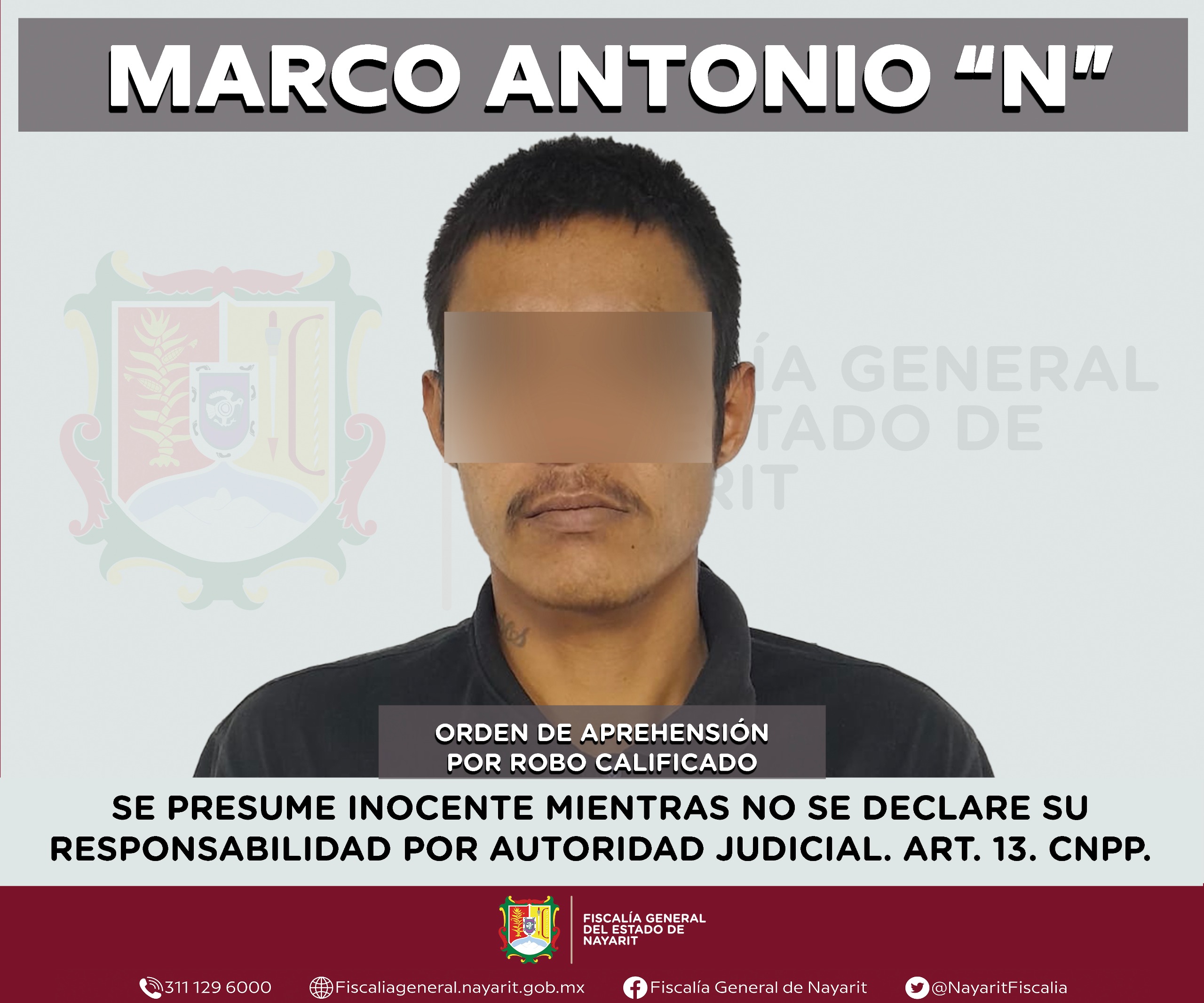 La Fiscalía General de Nayarit a través de la Agencia de Investigación Criminal ejecutó una orden de aprehensión en la ciudad de Tepic contra Marco Antonio “N”, por su presunta participación en hechos que según apreciación de la ley encuadran el delito de robo calificado, cometido en agravio de la cadena comercial Oxxo, S. A. de C. V.