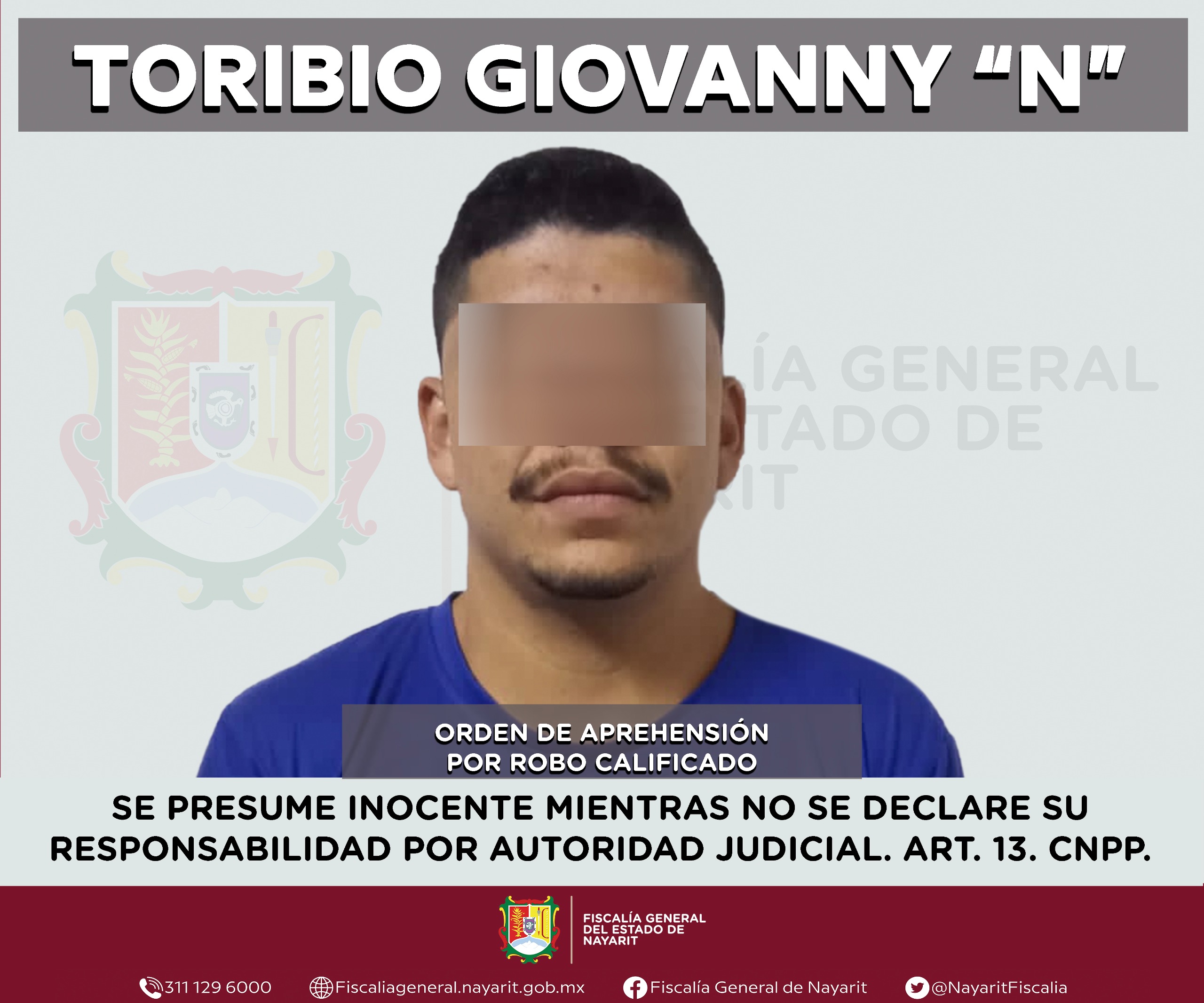 La Fiscalía General de Nayarit a través de la Agencia de Investigación Criminal ejecutó una orden de aprehensión contra Toribio Giovanny “N”, por su probable participación en hechos que para la ley configuran el delito de robo calificado, en perjuicio de una persona de sexo femenino cuya identidad se reserva para proteger su privacidad e integridad.