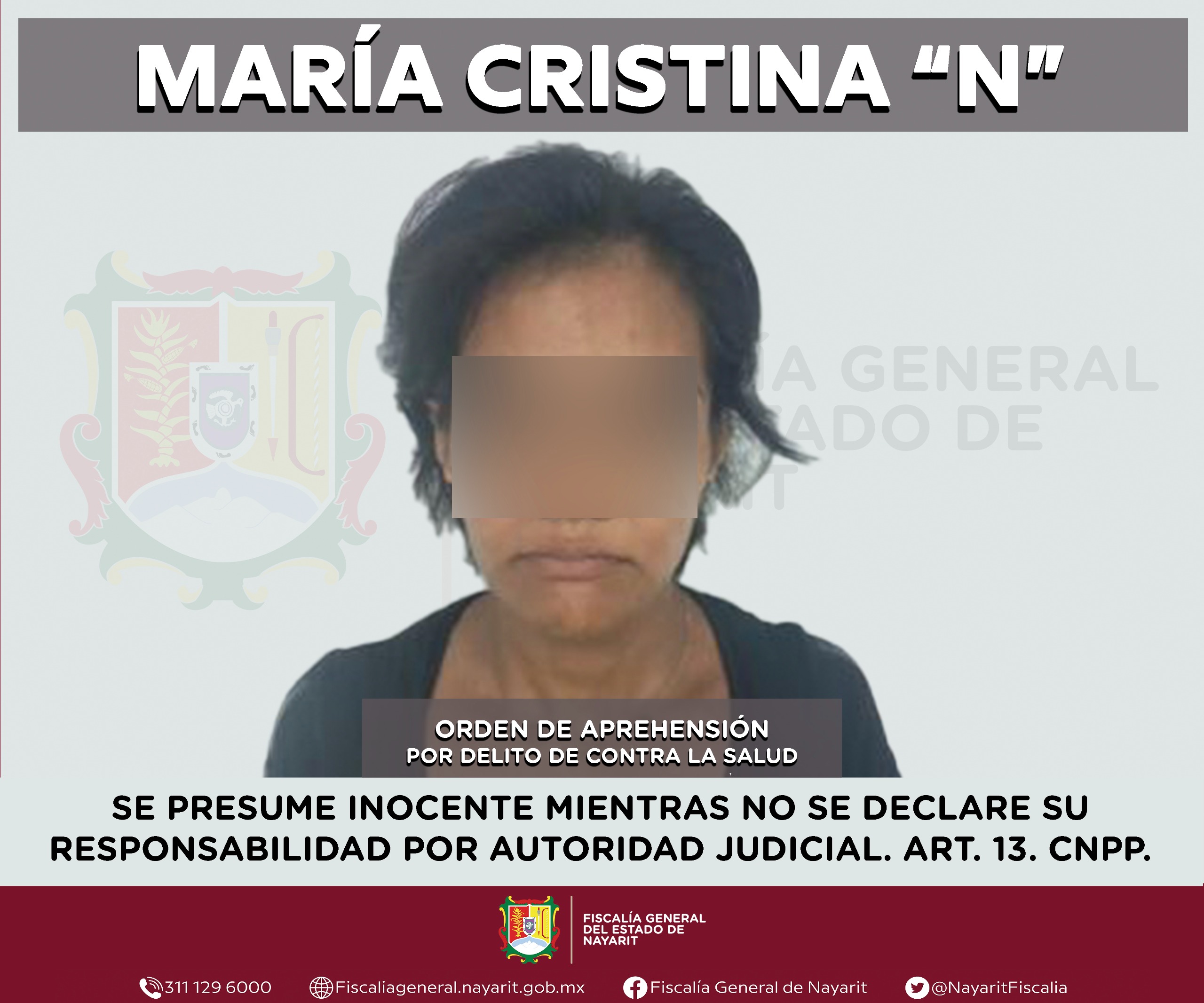 La Fiscalía General de Nayarit a través de la Agencia de Investigación Criminal ejecutó una orden de aprehensión en la ciudad de Tepic contra María Cristina “N”, por su presunta participación en hechos que según apreciación de la ley encuadran el delito contra la salud en su modalidad de narcomenudeo -en su hipótesis de posesión de psicotrópicos-, cometido contra la sociedad.