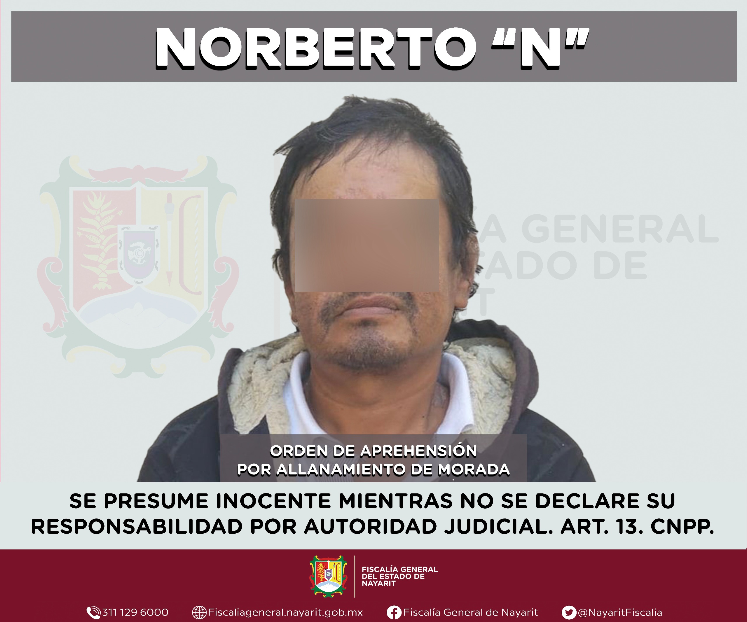 Elementos de la Agencia de Investigación Criminal de Nayarit ejecutaron una orden de aprehensión en la ciudad de Tepic contra Norberto “N”, por su probable participación en hechos que para la ley configuran el delito de allanamiento de morada, cometido en agravio de una persona de sexo femenino cuya identidad se reserva para salvaguardar su privacidad e integridad.