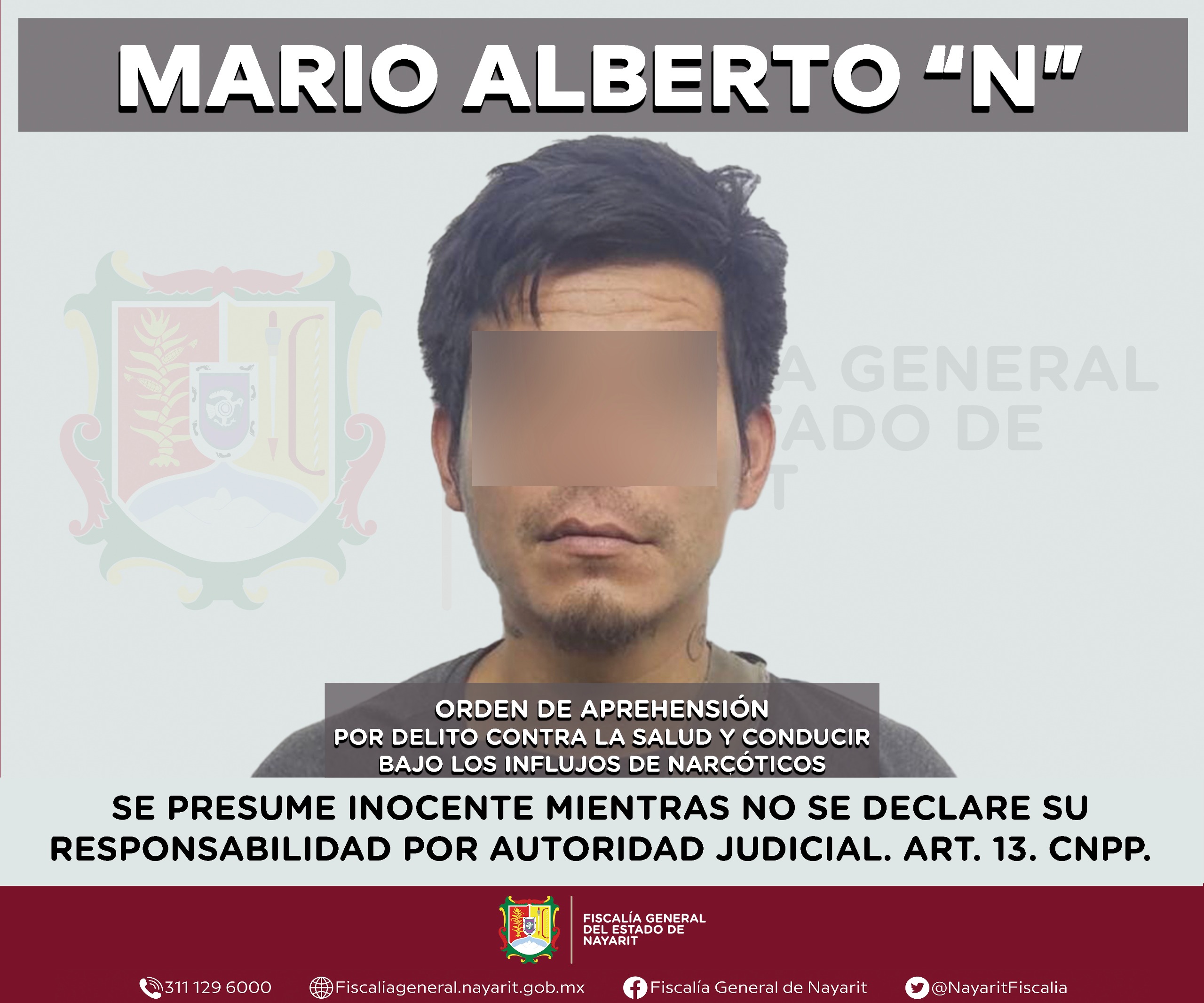 La Fiscalía General de Nayarit a través de la Agencia de Investigación Criminal ejecutó una orden de aprehensión contra Mario Alberto “N”, por su probable participación en hechos que para la ley configuran los delitos contra la salud en su modalidad de narcomenudeo -en su hipótesis de posesión de estupefacientes-, así como de tránsito ejecutado por conductores de vehículos -en su modalidad de conducir bajo la influencia de narcóticos-, delitos cometidos en agravio de la sociedad.