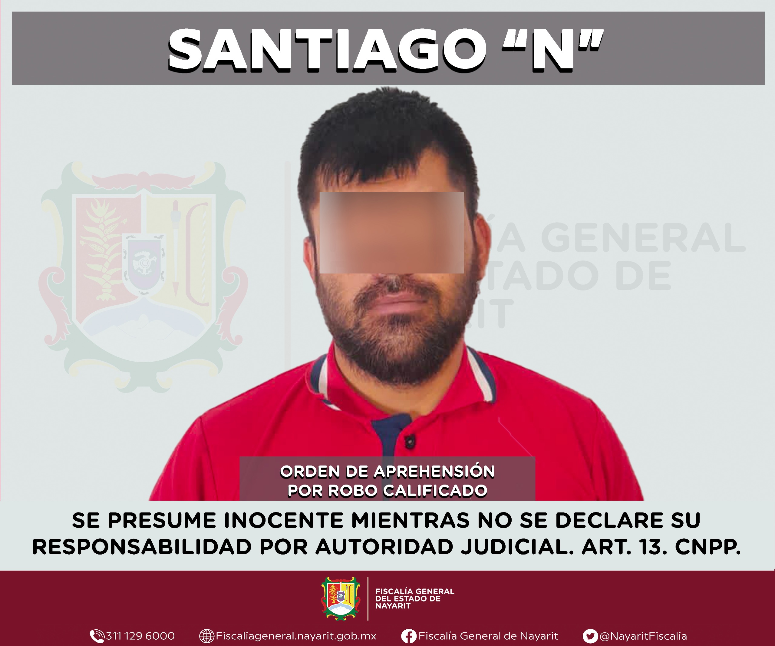 La Fiscalía General de Nayarit a través de la Agencia de Investigación Criminal ejecutó una orden de aprehensión contra Santiago “N”, por su probable participación en hechos que para la ley configuran el delito de robo calificado, cometidos en perjuicio de una persona de sexo masculino de identidad reservada.