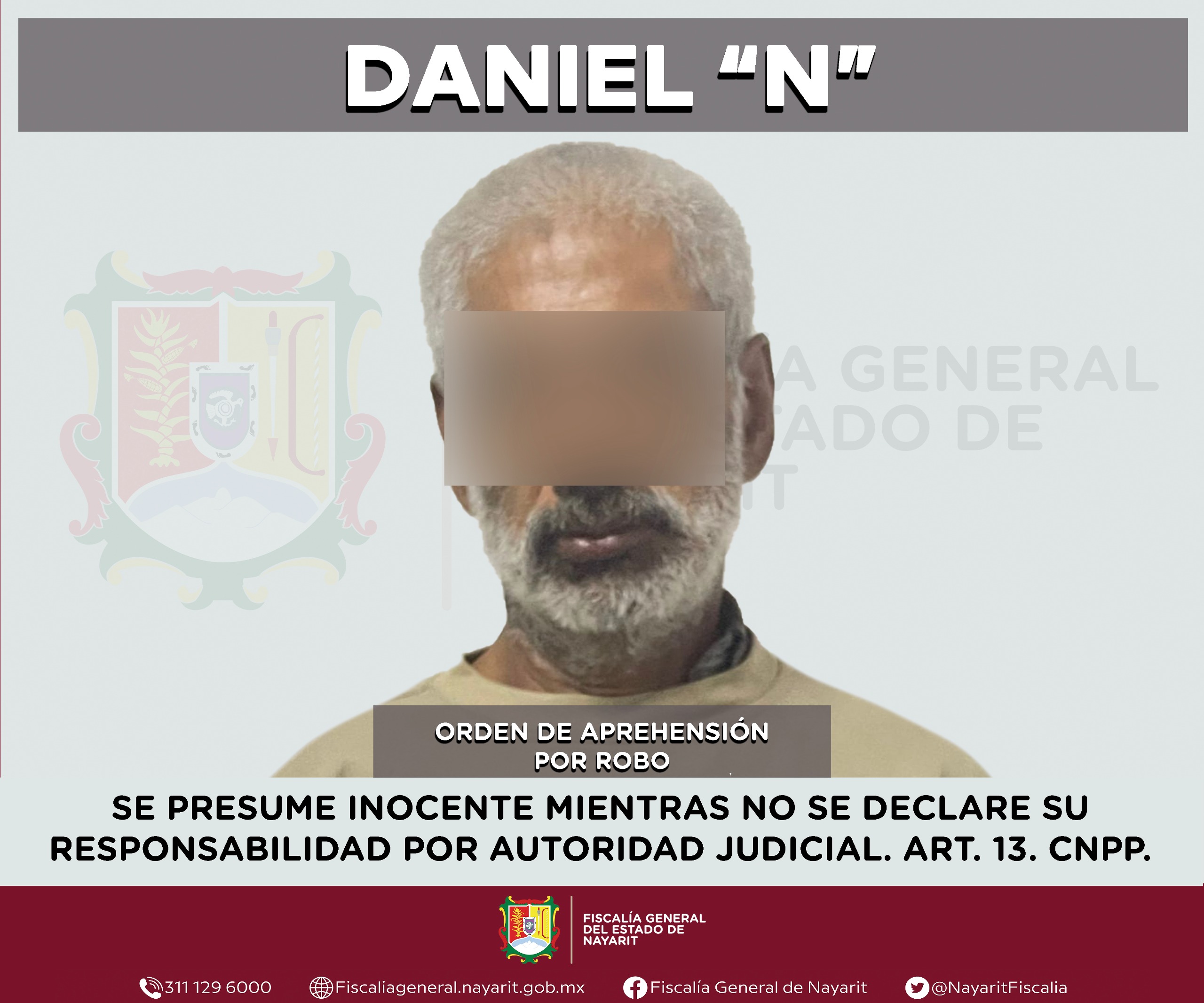 La Fiscalía General de Nayarit a través de la Agencia de Investigación Criminal ejecutó una orden de aprehensión en la ciudad de Tepic contra Daniel “N”, por su probable participación en hechos que para la ley configuran el delito de robo, cometido en agravio de una persona de sexo masculino cuya identidad se reserva para salvaguardar su privacidad e integridad.