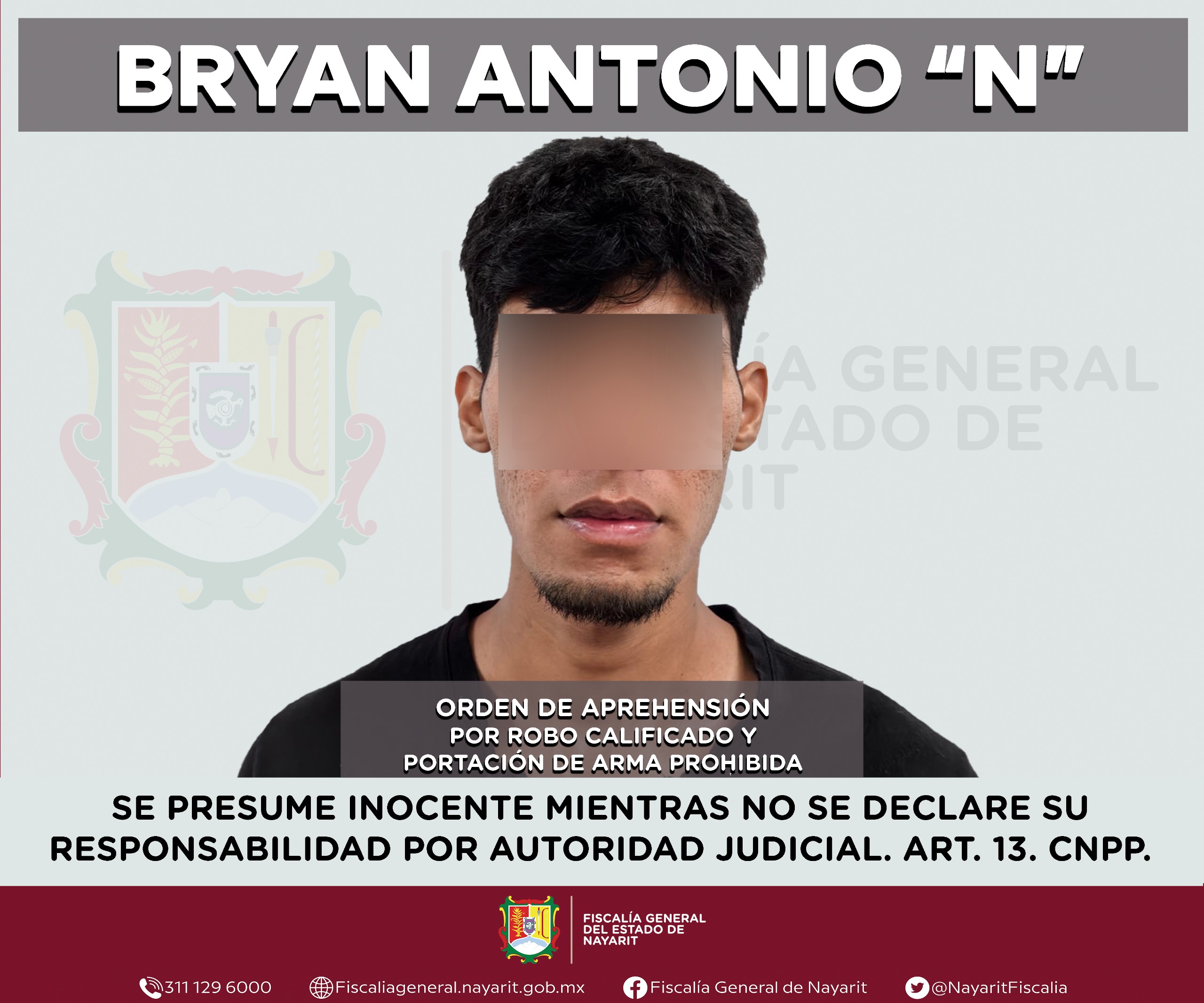 La Fiscalía General de Nayarit a través de la Agencia de Investigación Criminal ejecutó dos órdenes de aprehensión en la ciudad de Tepic contra Bryan Antonio “N”, la primera por su probable participación en hechos que para la ley configuran el delito de robo calificado, cometido en agravio de la cadena comercial Kiosko, S. A. de C. V., en tanto, la segunda orden de aprehensión es por su presunta responsabilidad en hechos que la ley señala como delito de armas prohibidas en su modalidad de portación, cometido contra la sociedad.
