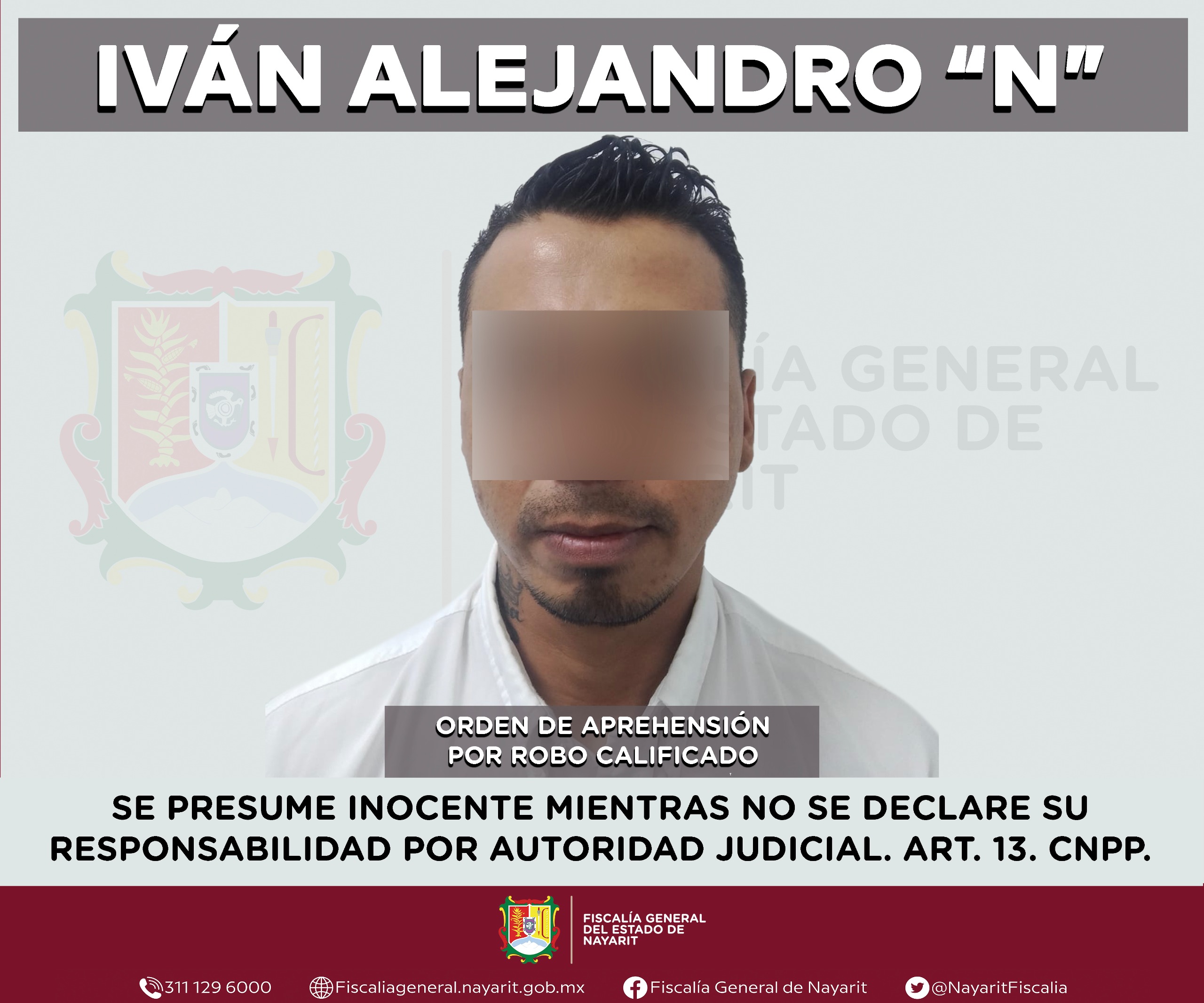 Elementos de la Agencia de Investigación Criminal de Nayarit ejecutaron una orden de aprehensión en la ciudad de Tepic contra Iván Alejandro “N”, por su probable participación en hechos que para la ley configuran el delito de robo calificado, cometido en perjuicio de la cadena comercial Oxxo, S. A. de C. V.