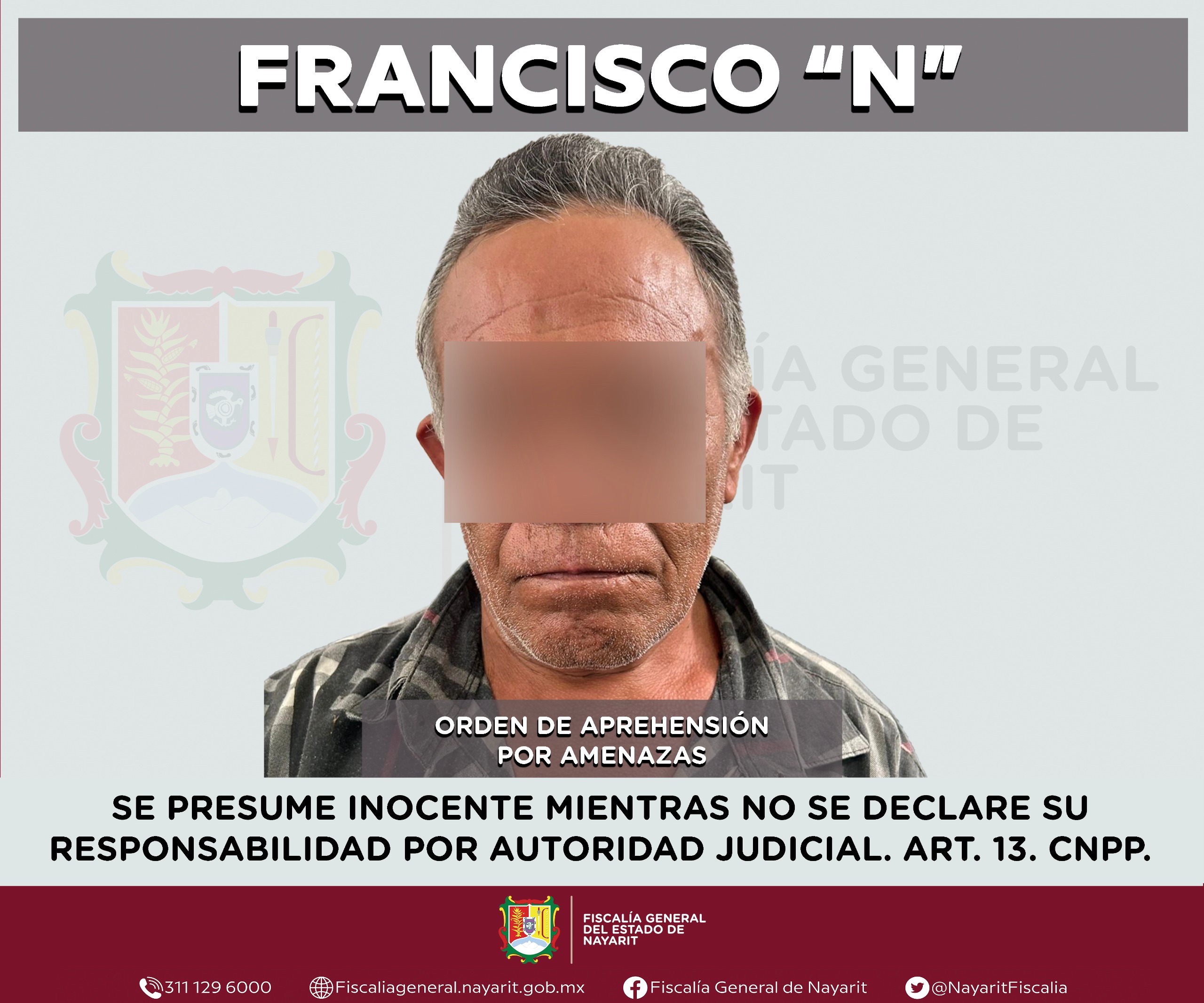 Elementos de la Agencia de Investigación Criminal de Nayarit ejecutaron una orden de aprehensión en la localidad Platanitos, municipio de Tepic contra Francisco “N”, por su probable participación en hechos que para la ley configuran el delito de amenazas, cometido en agravio de una persona de sexo femenino cuya identidad se reserva para salvaguardar su privacidad e integridad.