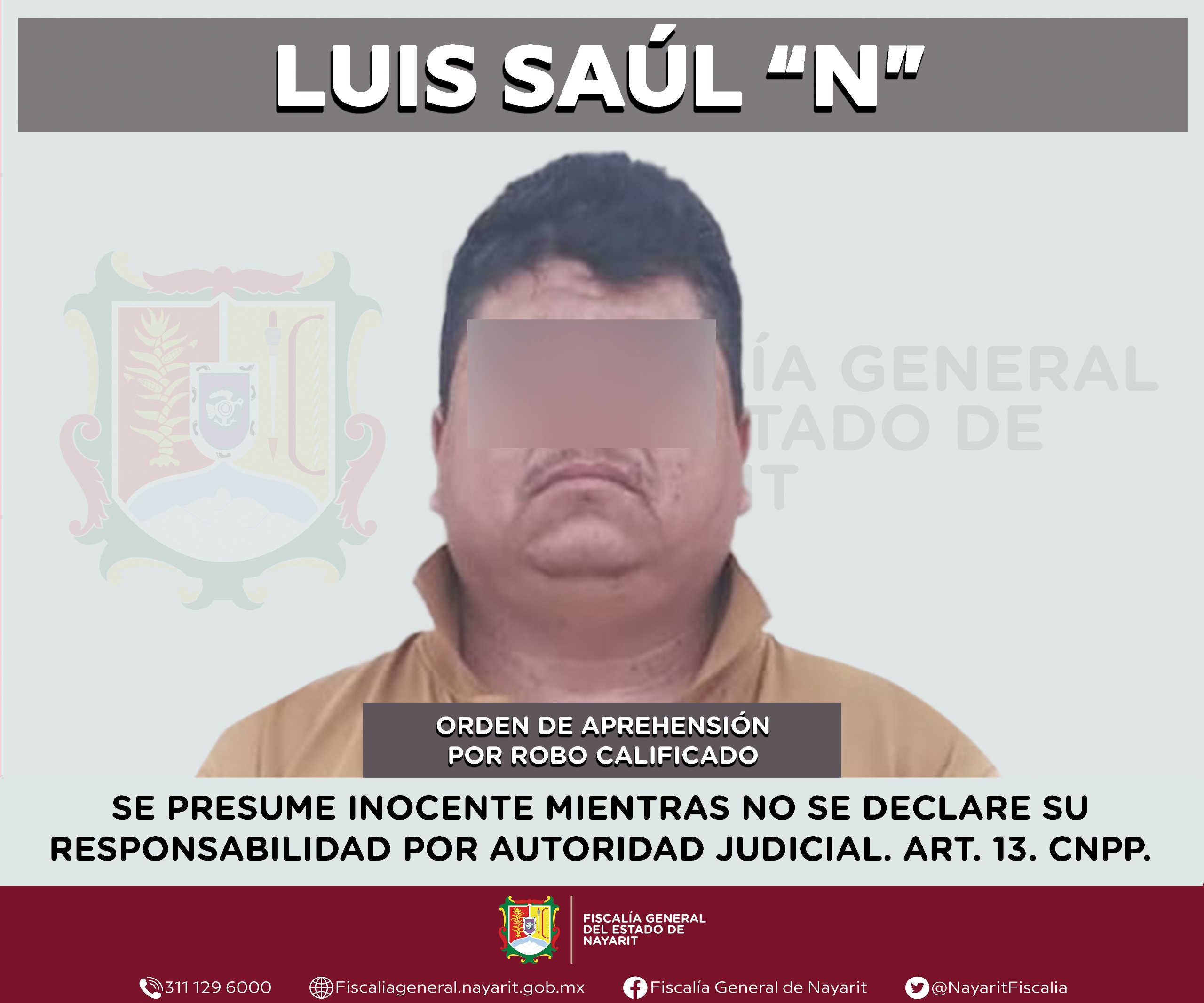 Elementos de la Agencia de Investigación Criminal de Nayarit ejecutaron una orden de aprehensión en la ciudad de Tepic contra Luis Saúl “N”, por su probable participación en hechos que para la ley configuran el delito de robo calificado, cometido en perjuicio de Aceros del Nayar, S. A. de C. V.