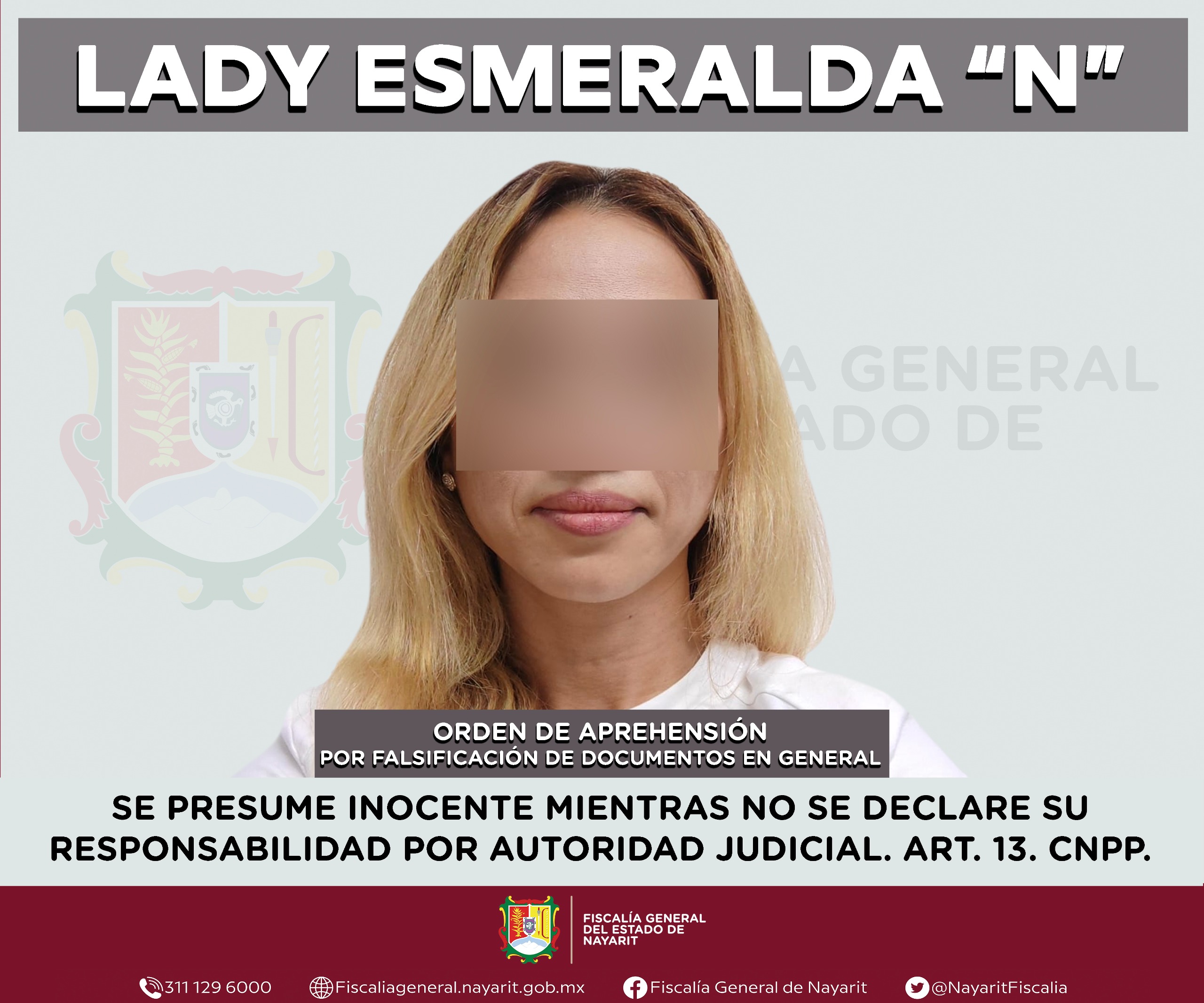 Elementos de la Agencia de Investigación Criminal de Nayarit ejecutaron una orden de aprehensión en la ciudad de Tepic contra Lady Esmeralda “N”, por su probable participación en hechos que para la ley configuran el delito de falsificación de documentos en general cometido contra la Universidad Autónoma de Nayarit y de la sociedad.