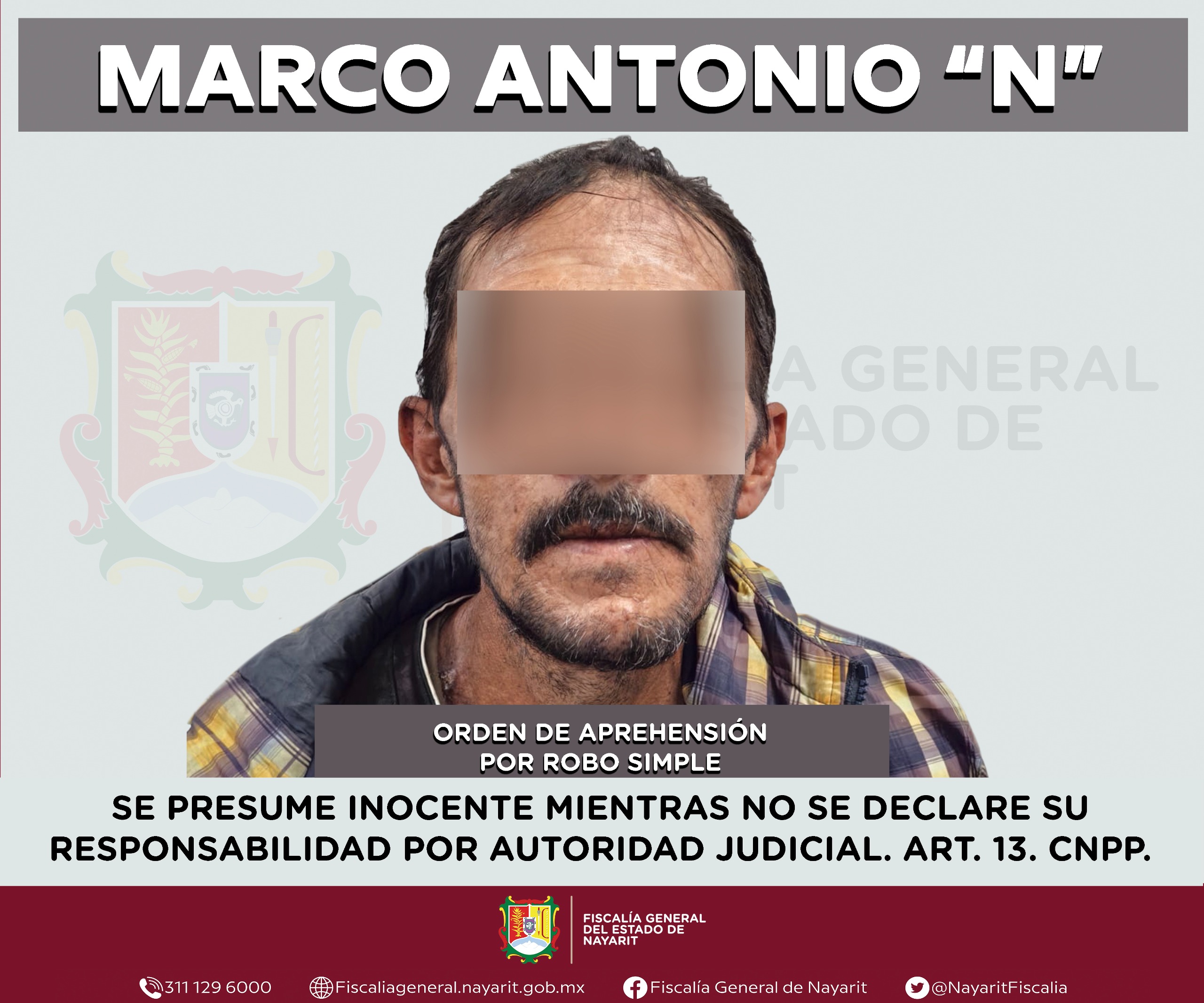 La Fiscalía General de Nayarit a través de la Agencia de Investigación Criminal ejecutó una orden de aprehensión en el municipio de Xalisco contra Marco Antonio “N”, por su probable participación en hechos que para la ley configuran el delito de robo simple, ilícito cometido contra la tienda comercial Coppel, S. A. de C. V.
