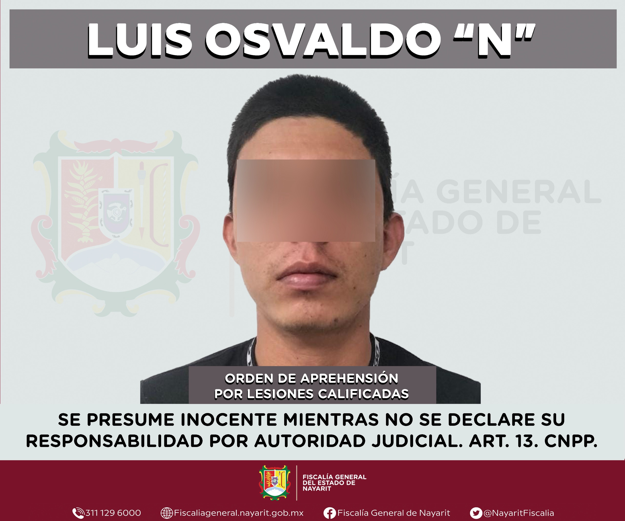 La Fiscalía General de Nayarit a través de la Agencia de Investigación Criminal ejecutó una orden de aprehensión en el municipio de Bahía de Banderas contra Luis Osvaldo “N”, por su probable participación en hechos que para la ley configuran el delito de lesiones calificadas, ilícito cometido contra una persona de sexo masculino de la cual se reserva la identidad para salvaguardar su privacidad e integridad.