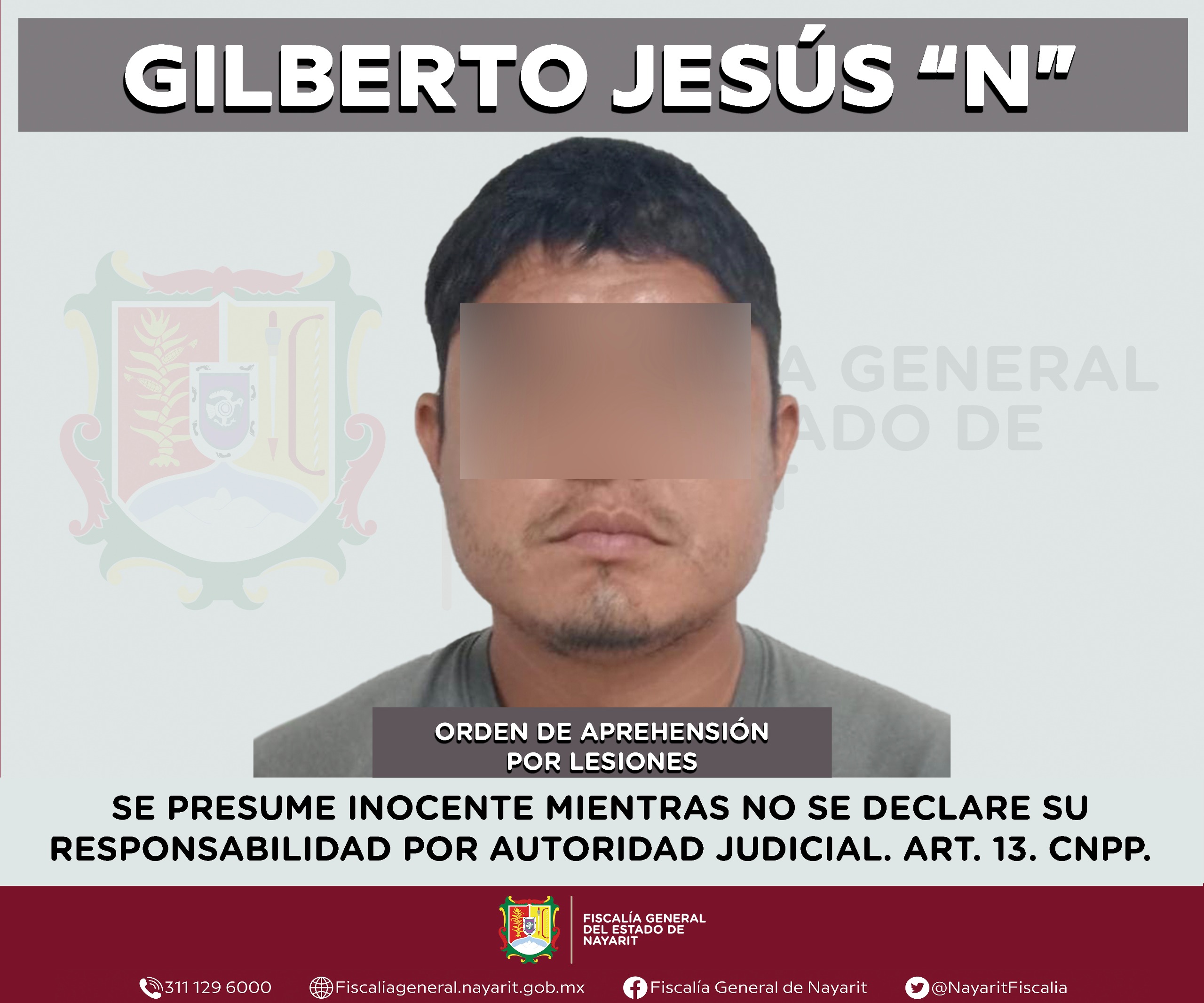 Elementos de la Agencia de Investigación Criminal de Nayarit ejecutaron una orden de aprehensión en la localidad Aticama, municipio de San Blas contra Gilberto Jesús “N”, por su probable participación en hechos que para la ley configuran el delito de lesiones, cometido contra una persona de sexo masculino de la cual se reserva la identidad para salvaguardar su privacidad e integridad.