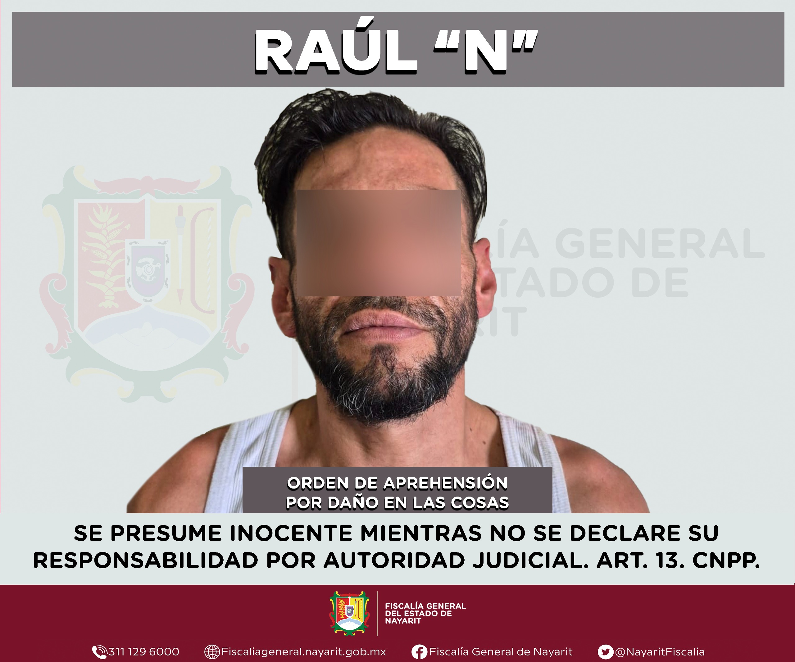 La Fiscalía General de Nayarit a través de la Agencia de Investigación Criminal ejecutó una orden de aprehensión en la ciudad de Tepic contra Raúl “N”, por su probable participación en hechos que para la ley configuran el delito de daño en las cosas, en perjuicio de una persona de sexo femenino de la cual se reserva la identidad para salvaguardar su privacidad e integridad.