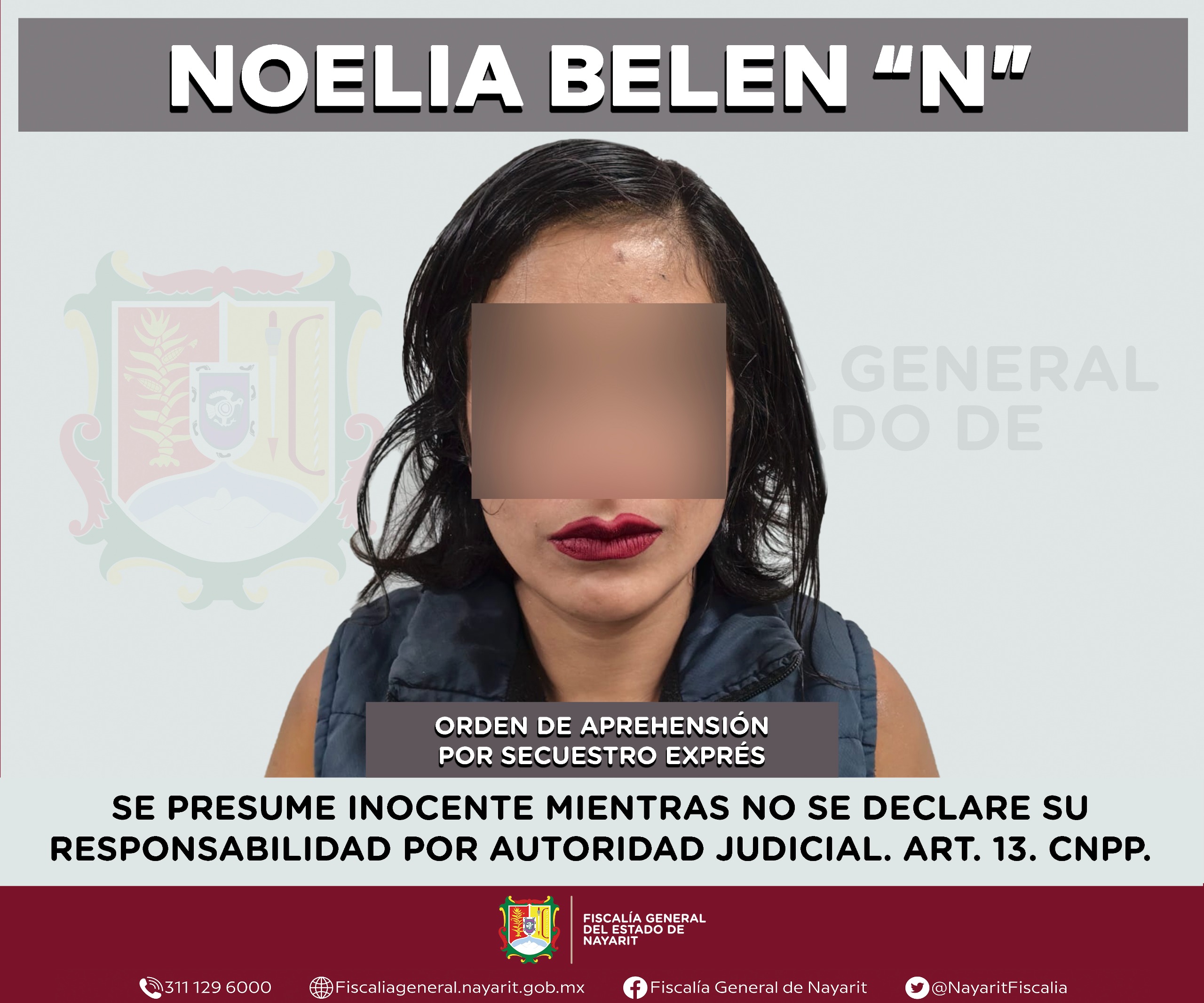 La Fiscalía General de Nayarit a través de la Agencia de Investigación Criminal ejecutó una orden de aprehensión en el municipio de Xalisco contra Noelia Belén “N”, por su probable participación en hechos que para la ley configuran el delito de secuestro exprés. La identidad de la víctima se reserva para salvaguardar su privacidad.