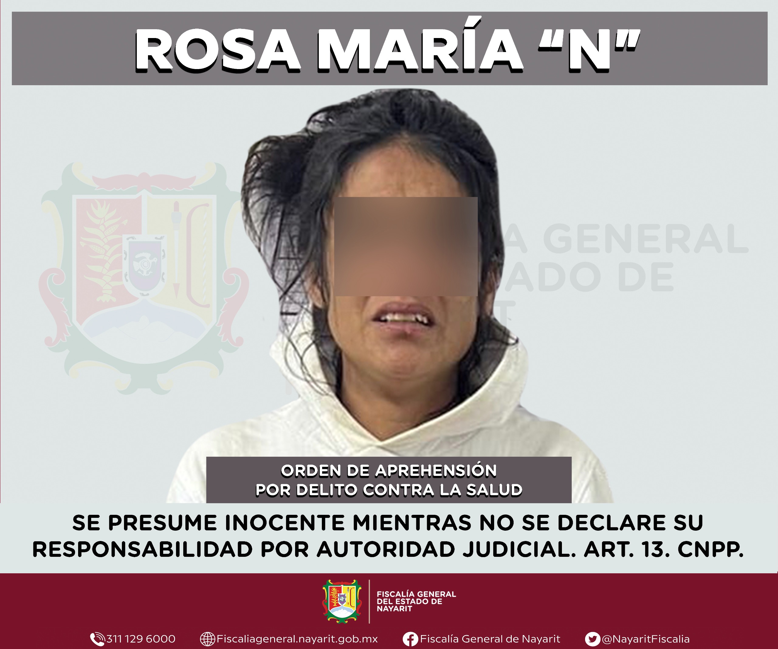 La Fiscalía General de Nayarit a través de la Agencia de Investigación Criminal ejecutó una orden de aprehensión en la ciudad de Tepic contra Rosa María “N”, por su probable participación en hechos que para la ley configuran el delito contra la salud en su modalidad de narcomenudeo -en su hipótesis de posesión de estupefacientes-, cometido en agravio de la sociedad.
