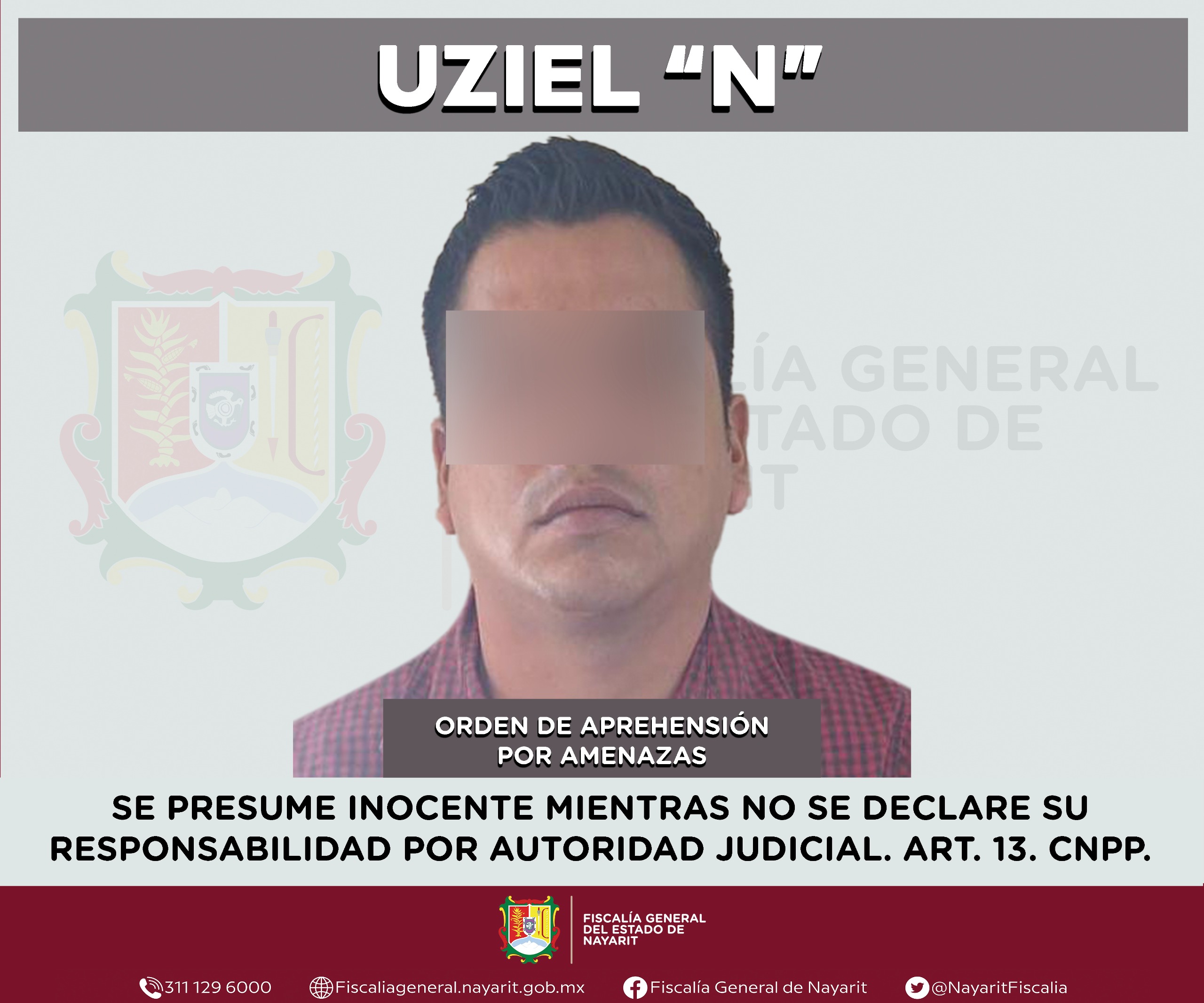 Elementos de la Agencia de Investigación Criminal cumplimentaron una orden de aprehensión en la localidad Mora, municipio de Tepic contra Uziel “N”, por su probable participación en hechos que la legislación vigente tipifica como delito de amenazas, en agravio de una persona de sexo masculino de quien se reserva la identidad para salvaguardar su privacidad.