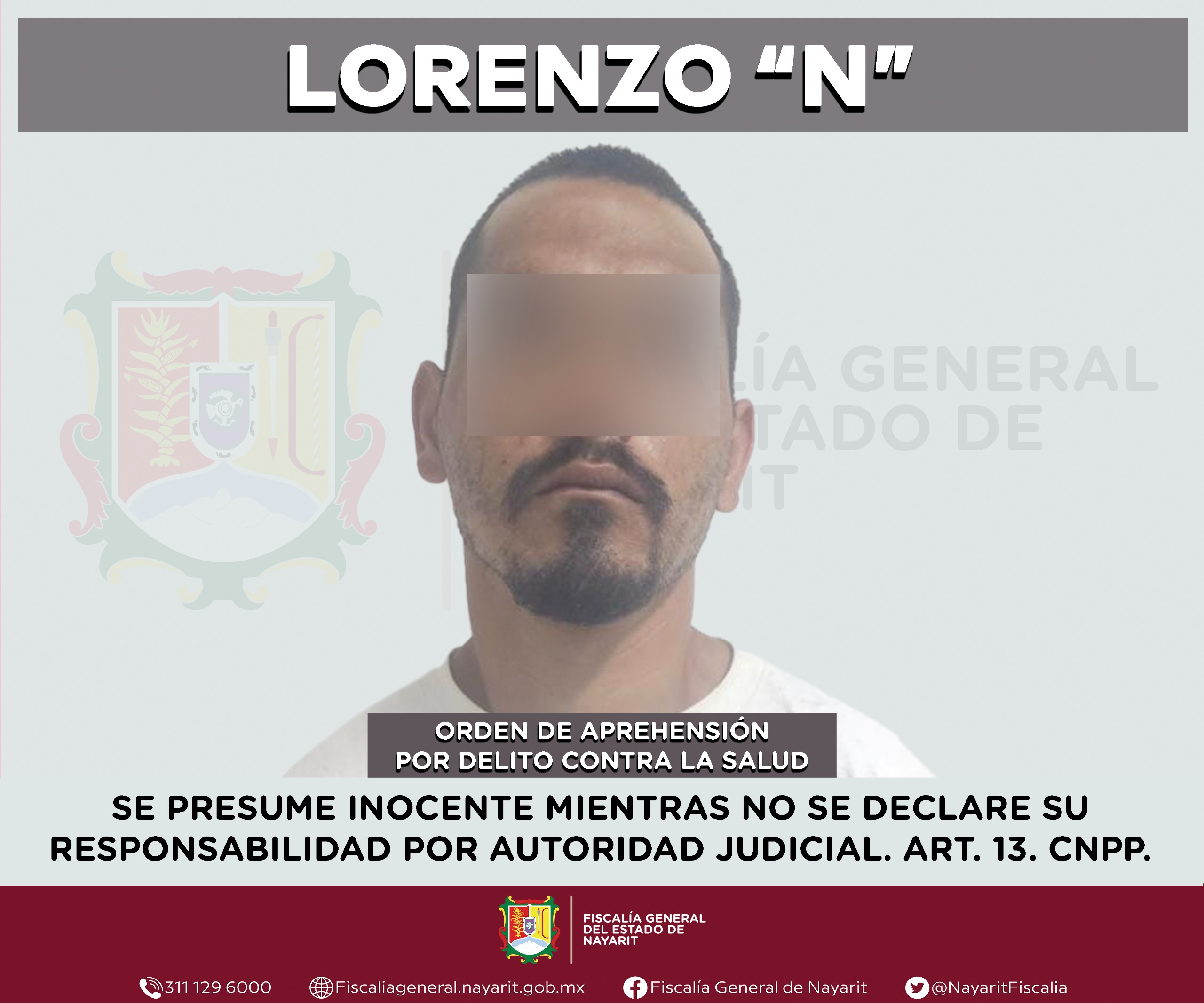 La Fiscalía General de Nayarit a través de la Agencia de Investigación Criminal ejecutó una orden de aprehensión en la ciudad de Tepic contra Lorenzo “N”, por su presumible participación en hechos que para la ley configuran el delito contra la salud en su modalidad de narcomenudeo -en su hipótesis de posesión de psicotrópicos-, cometido contra la sociedad.