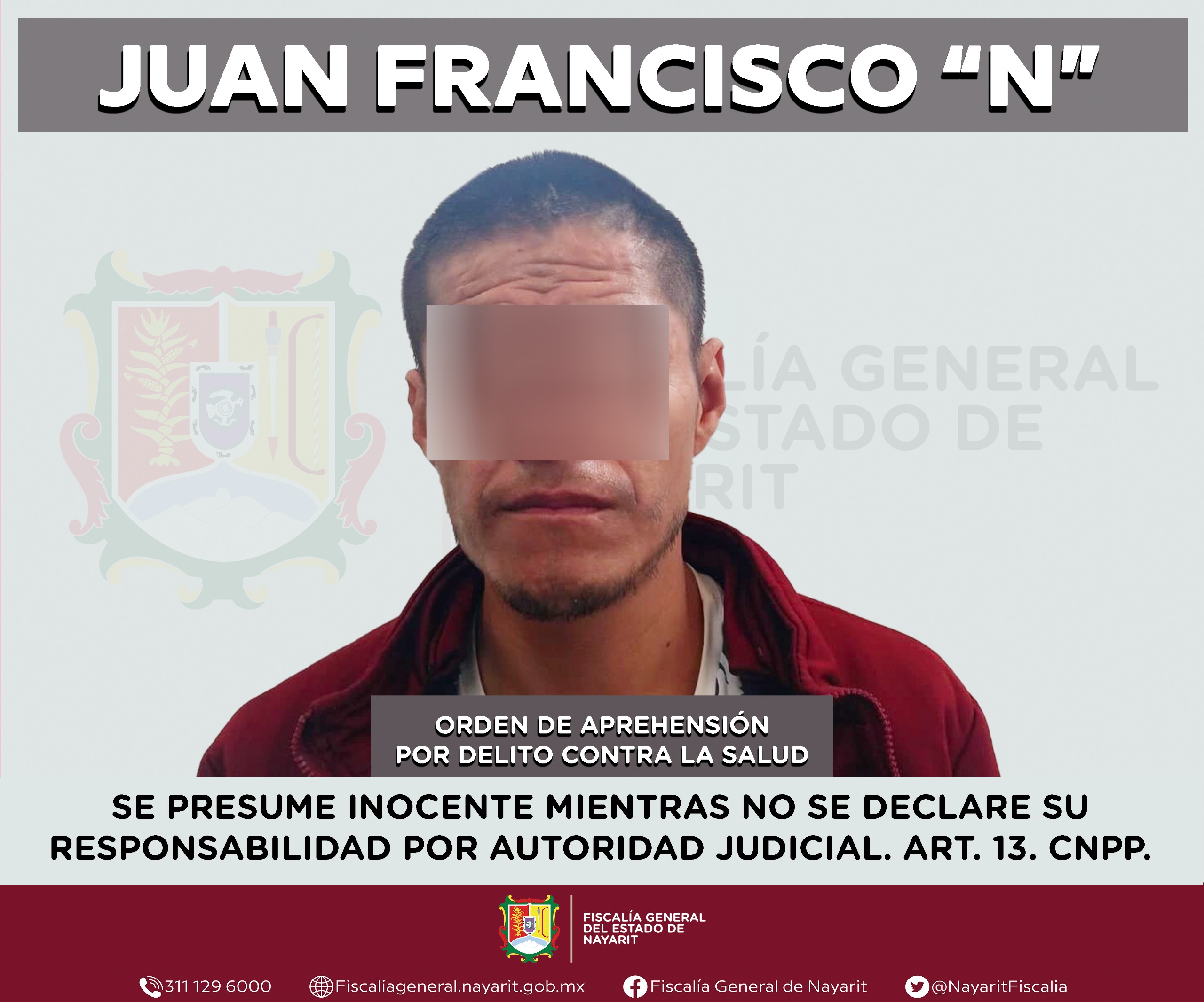 La Fiscalía General de Nayarit a través de la Agencia de Investigación Criminal ejecutó una orden de aprehensión en la ciudad de Tepic contra Juan Francisco “N”, por su probable participación en hechos que para la ley configuran el delito contra la salud en su modalidad de narcomenudeo -en su hipótesis de posesión de psicotrópicos-, cometido en agravio de la sociedad.