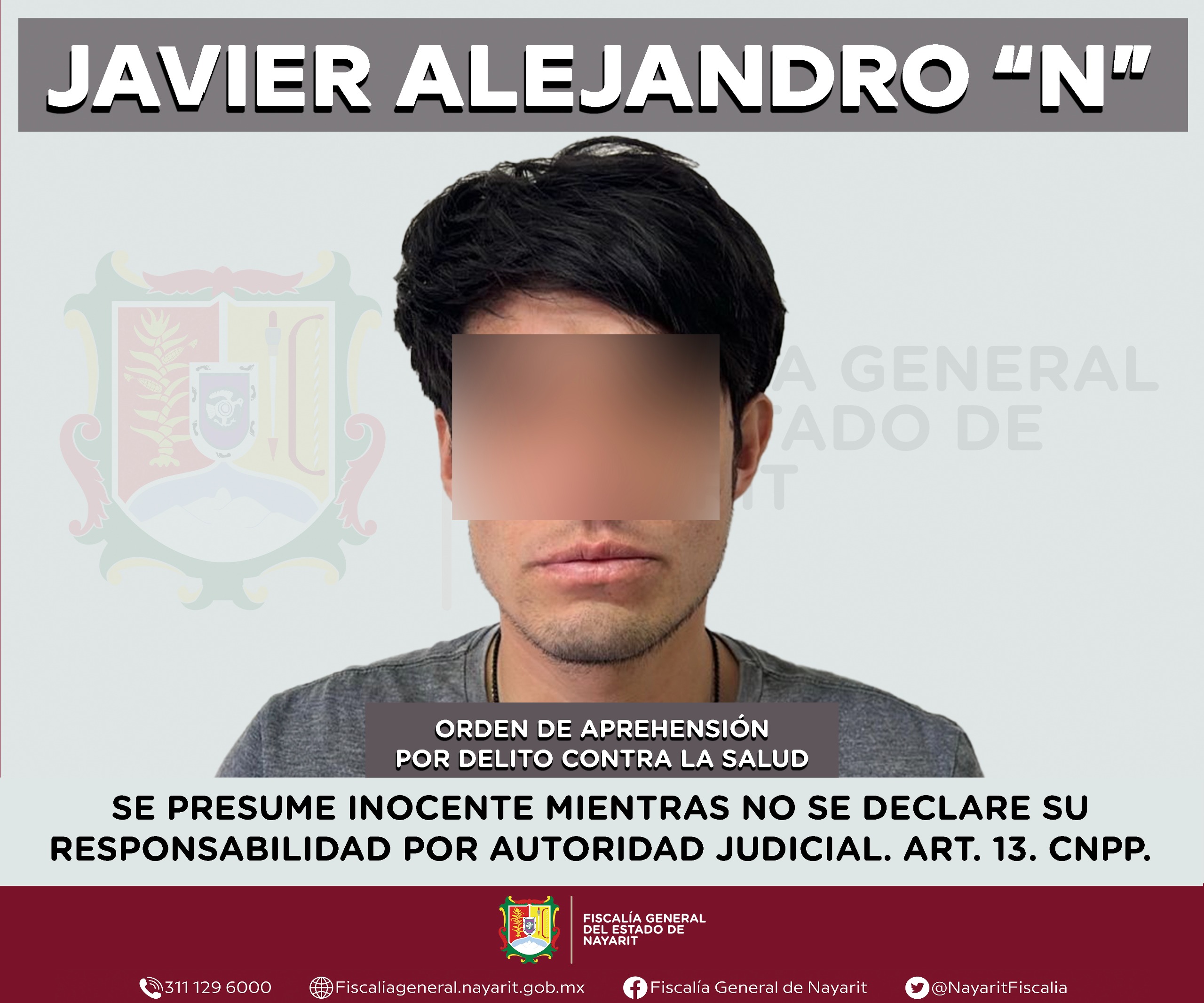 La Fiscalía General de Nayarit a través de la Agencia de Investigación Criminal ejecutó una orden de aprehensión en la ciudad de Tepic contra Javier Alejandro “N”, por su presumible participación en hechos que para la ley configuran el delito contra la salud en su modalidad de narcomenudeo -en su hipotesis de posesión de psicotrópicos-, ilícito cometido contra la sociedad.