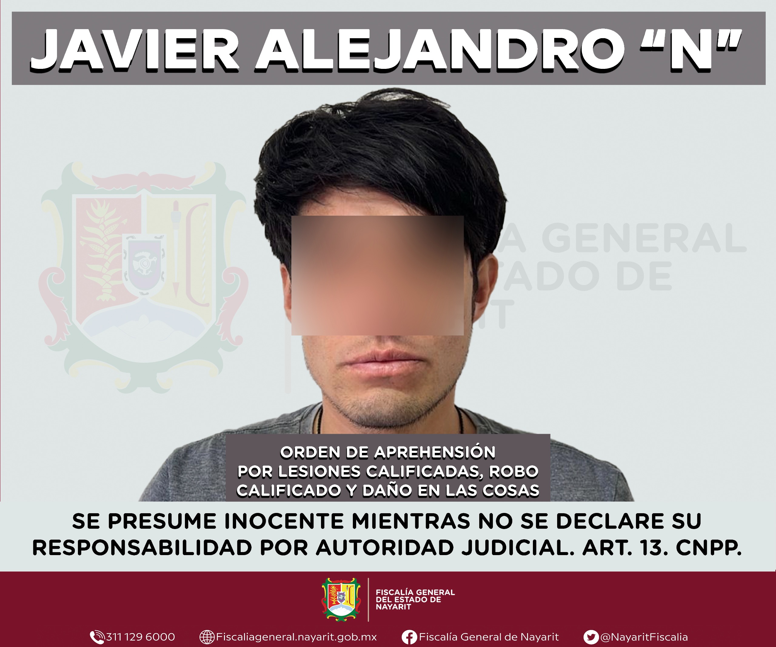 La Fiscalía General de Nayarit a través de la Agencia de Investigación Criminal ejecutó una orden de aprehensión contra Javier Alejandro “N”, por su presumible participación en hechos que para la ley configuran los delitos de lesiones calificadas, robo calificado -camioneta- y daño en las cosas, ilícitos cometidos contra una persona de sexo masculino de quien se reserva la identidad para salvaguardar su privacidad e integridad.