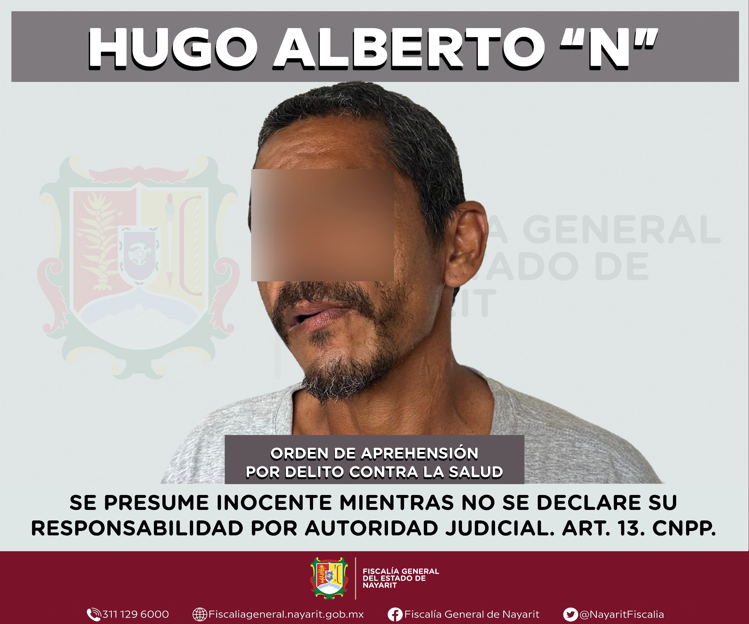 La Fiscalía General de Nayarit a través de la Agencia de Investigación Criminal ejecutó una orden de aprehensión en la capital nayarita contra Hugo Alberto “N”, por su presumible participación en hechos que para la ley configuran el delito contra la salud en su modalidad de narcomenudeo -en su hipótesis de posesión de psicotrópicos-, cometido en agravio de la sociedad.