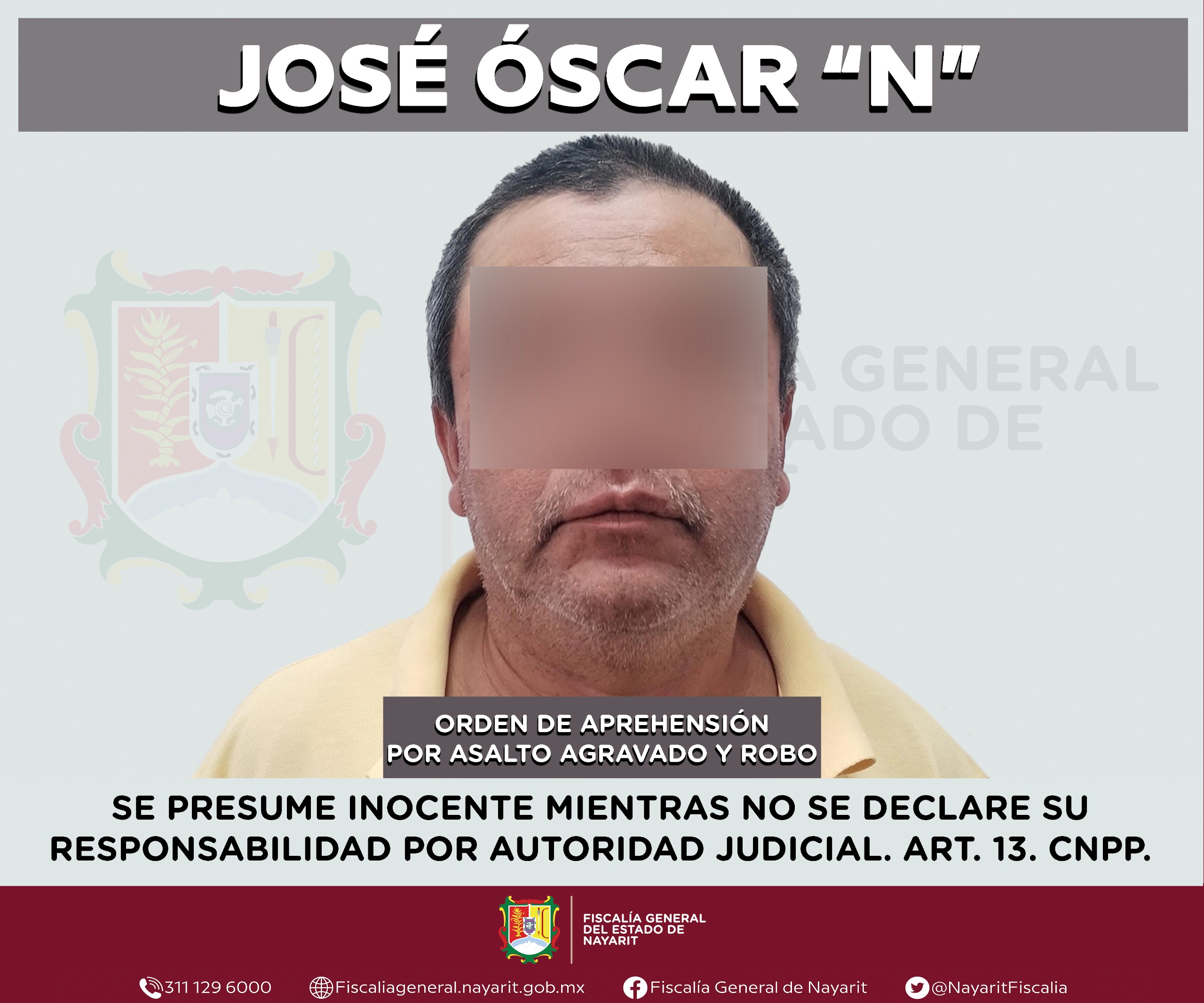 La Fiscalía General de Nayarit a través de la Agencia de Investigación Criminal ejecutó una orden de aprehensión en el municipio de Bahía de Banderas contra José Óscar “N”, por su presumible participación en hechos que para la ley configuran los delitos de asalto agravado y robo, cometidos en agravio de dos personas de sexo masculino cuyas identidades son reservadas para salvaguardar su privacidad e integridad.