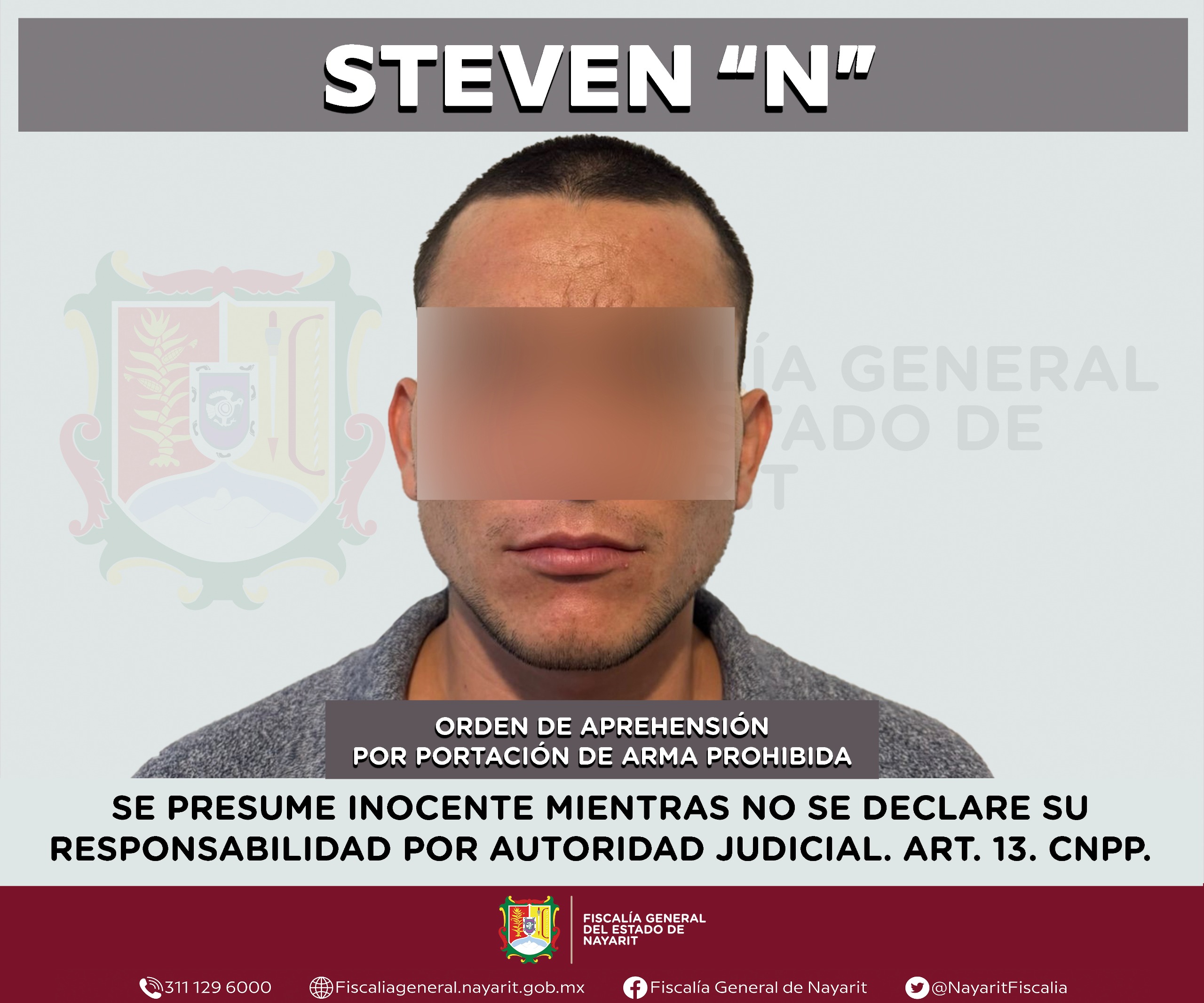 La Fiscalía General de Nayarit a través de la Agencia de Investigación Criminal ejecutó una orden de aprehensión en la localidad San Vicente, municipio de Bahía de Banderas contra Steven “N”, por su presumible participación en hechos que según la ley configuran el delito de arma prohibida en su modalidad de portación, ilícito cometido contra la sociedad.
