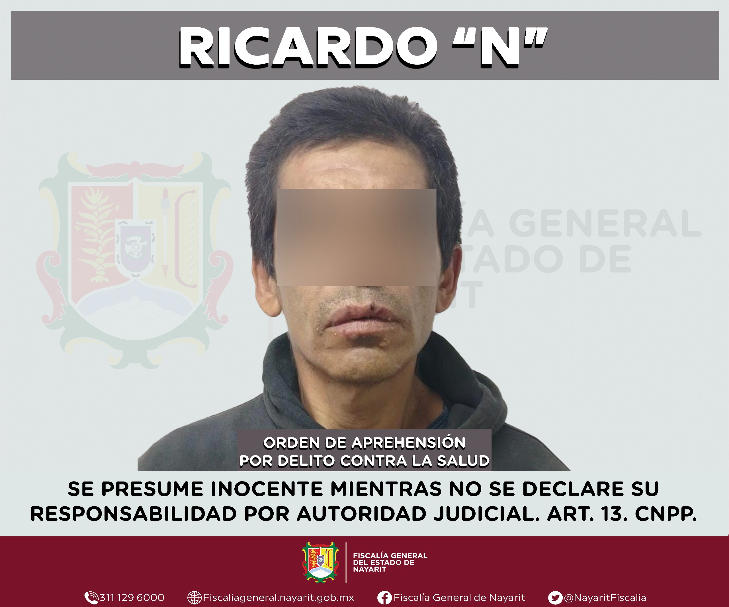 Elementos de la Agencia de Investigación Criminal de Nayarit ejecutaron una orden de aprehensión en la ciudad de Tepic contra Ricardo “N”, por su presumible participación en hechos que para la ley configuran el delito contra la salud en su modalidad de narcomenudeo -en su hipótesis de posesión de estupefacientes-, cometido en agravio de la sociedad.