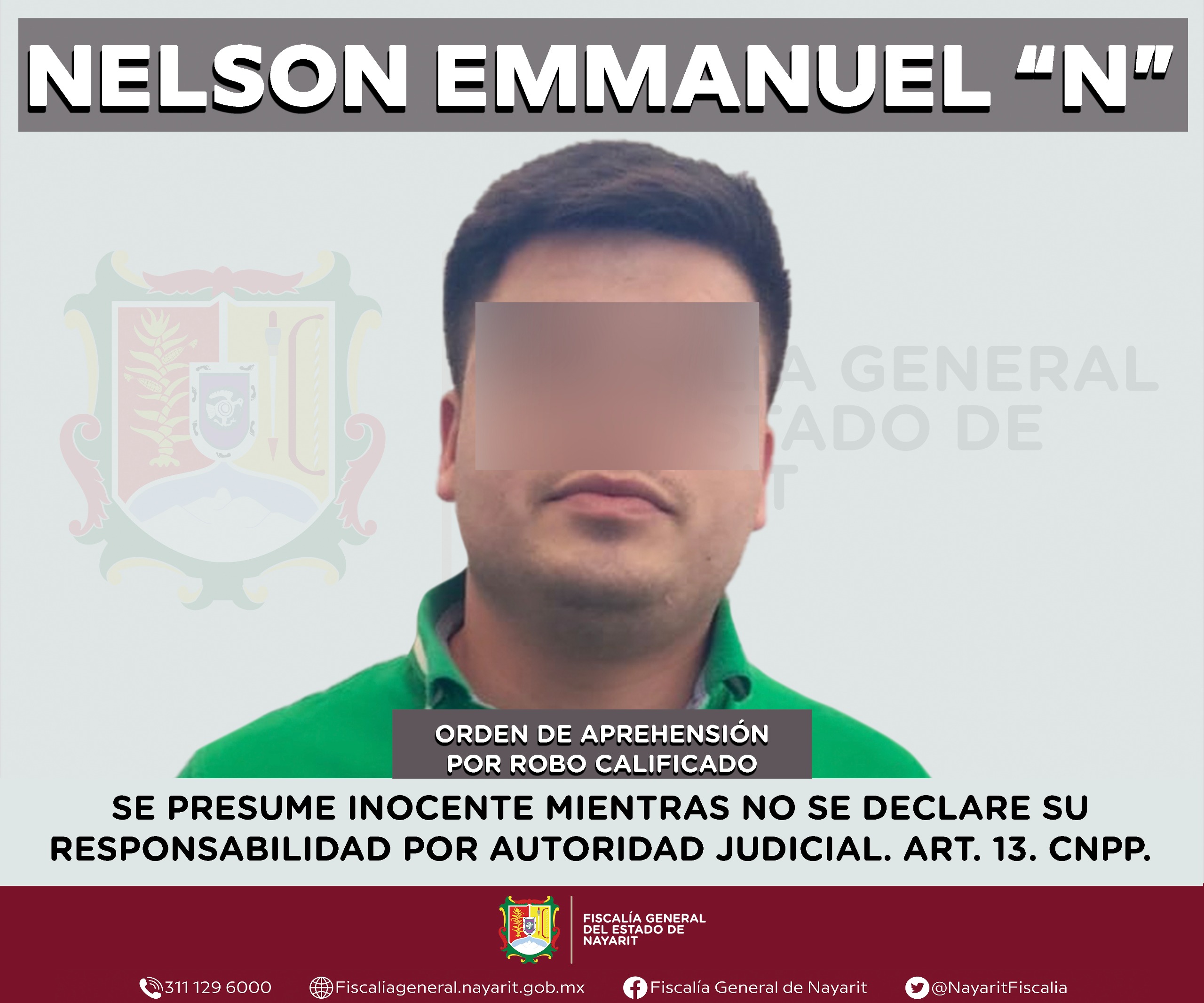 La Fiscalía General de Nayarit a través de la Agencia de Investigación Criminal ejecutó una orden de aprehensión en la ciudad de Tepic contra Nelson Emmanuel “N”, por su presumible participación en hechos que para la ley configuran el delito de robo calificado, cometido en perjuicio de la cadena comercial Kiosko, S. A. de C. V.