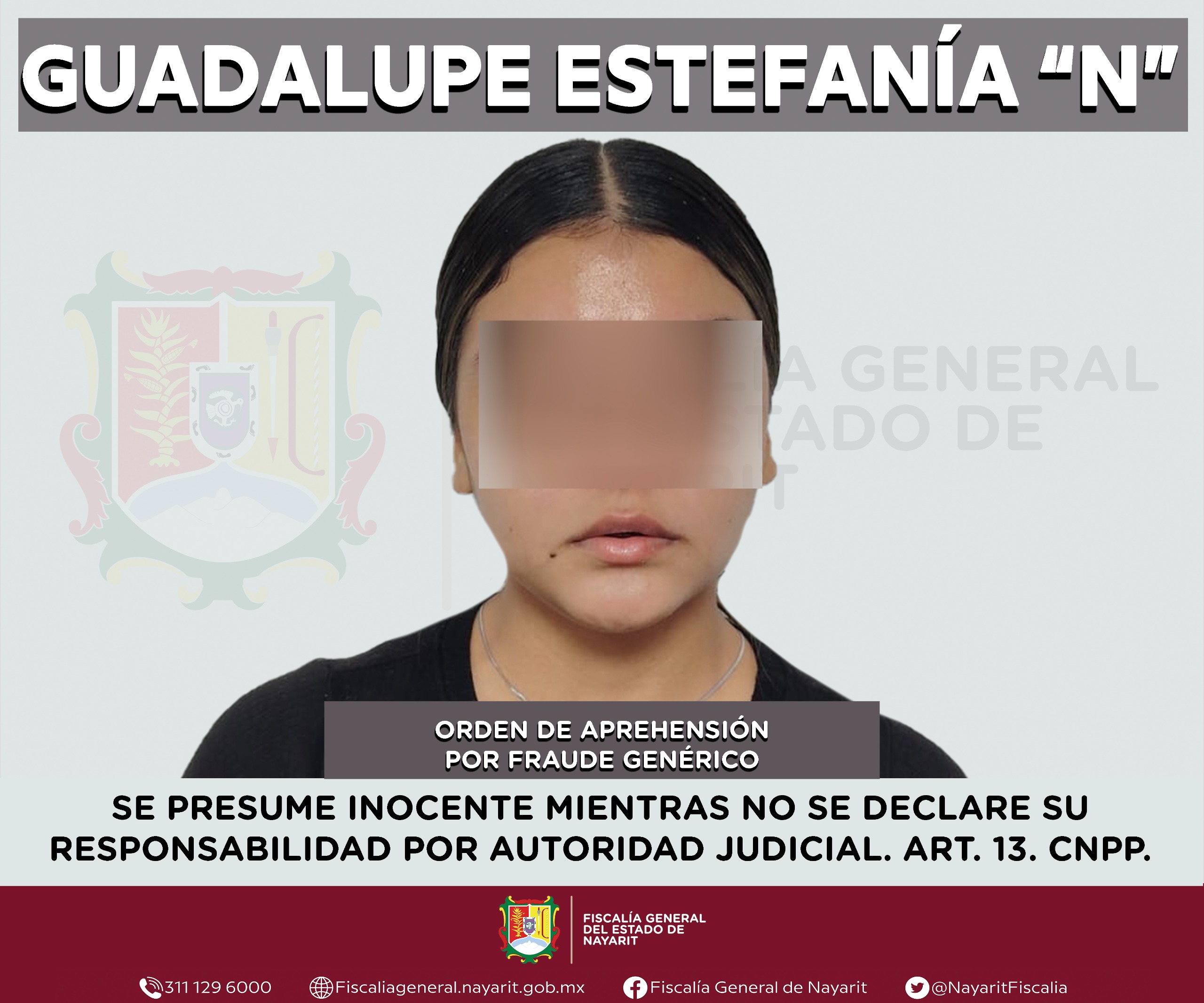 Elementos de la Agencia de Investigación Criminal de Nayarit ejecutaron una orden de aprehensión en la ciudad de Tepic contra Guadalupe Estefanía “N”, por su presumible participación en hechos que para la ley configuran el delito de fraude genérico, cometido en agravio de una persona de sexo masculino cuya identidad se reserva para salvaguardar su privacidad e integridad.