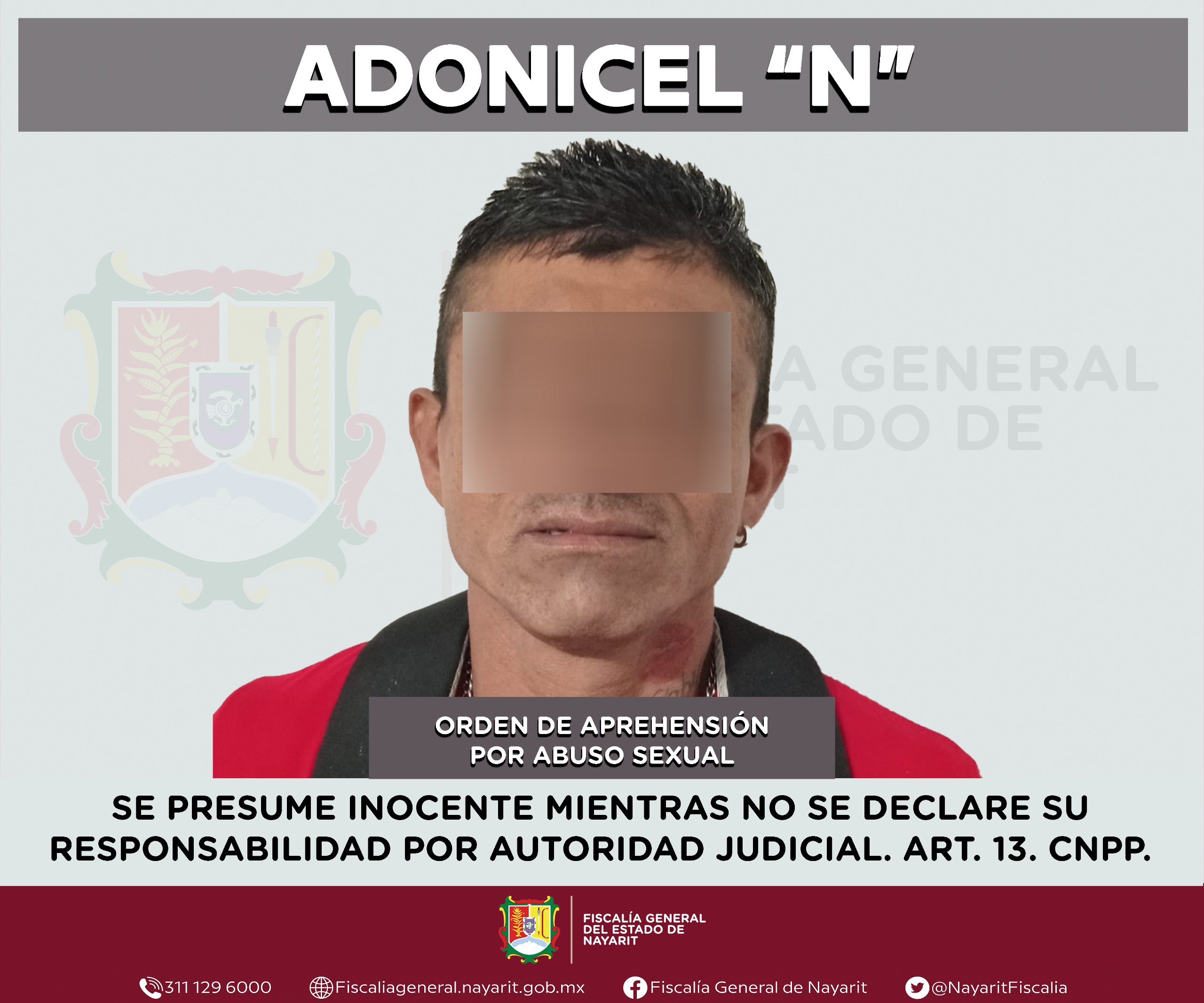Elementos de la Agencia de Investigación Criminal de Nayarit ejecutaron una orden de aprehensión en la localidad San Francisco, municipio de Bahía de Banderas contra Adonicel “N”, por su presumible participación en hechos que la ley considera como delito de abuso sexual, ilícito cometido en agravio de una menor de edad cuya identidad es reservada con el objetivo de salvaguardar su privacidad e integridad.