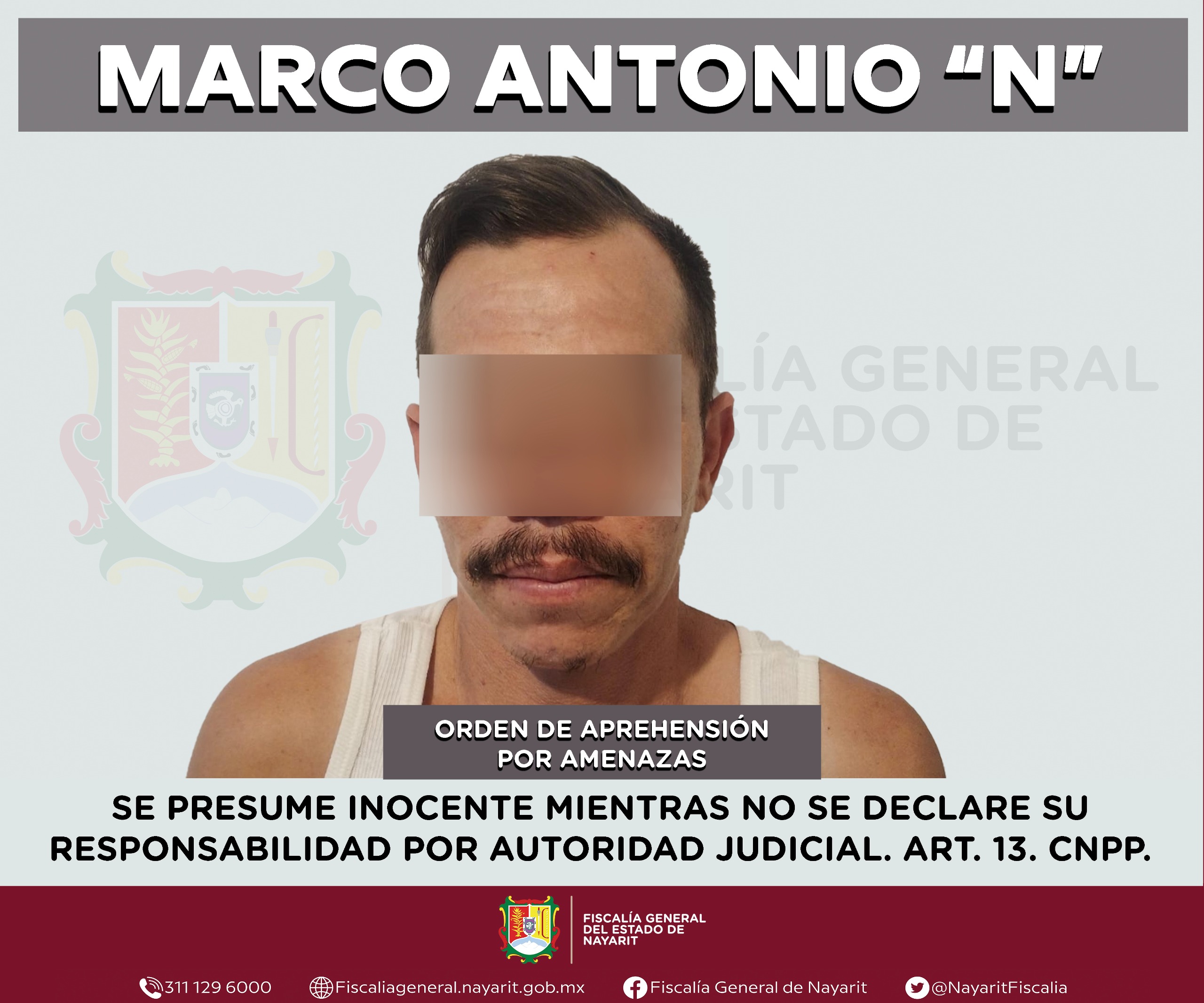 Elementos de la Agencia de Investigación Criminal de Nayarit ejecutaron una orden de aprehensión en el municipio de Bahía de Banderas contra Marco Antonio “N”, por su presunta participación en hechos que la ley tipifica como delito de amenazas, cometido en agravio de una persona de sexo femenino cuya identidad se reserva para salvaguardar su privacidad e integridad.