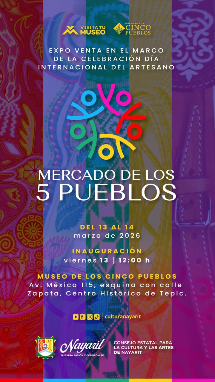 El Gobierno del Estado de Nayarit, a través del CECAN, te invita a celebrar el Día Internacional del Artesano, en el Mercado de los 5 Pueblos, un espacio dedicado a reconocer el talento y la tradición artesanal de Nayarit.