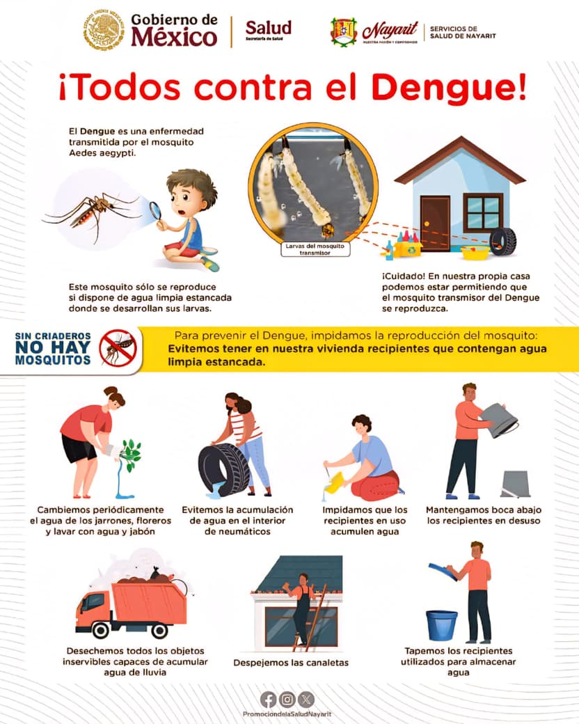 El Gobierno del Estado, a través de los Servicios de Salud de Nayarit, hace un llamado a la población a revisar patios, azoteas y espacios del hogar donde puedan acumularse recipientes con agua.