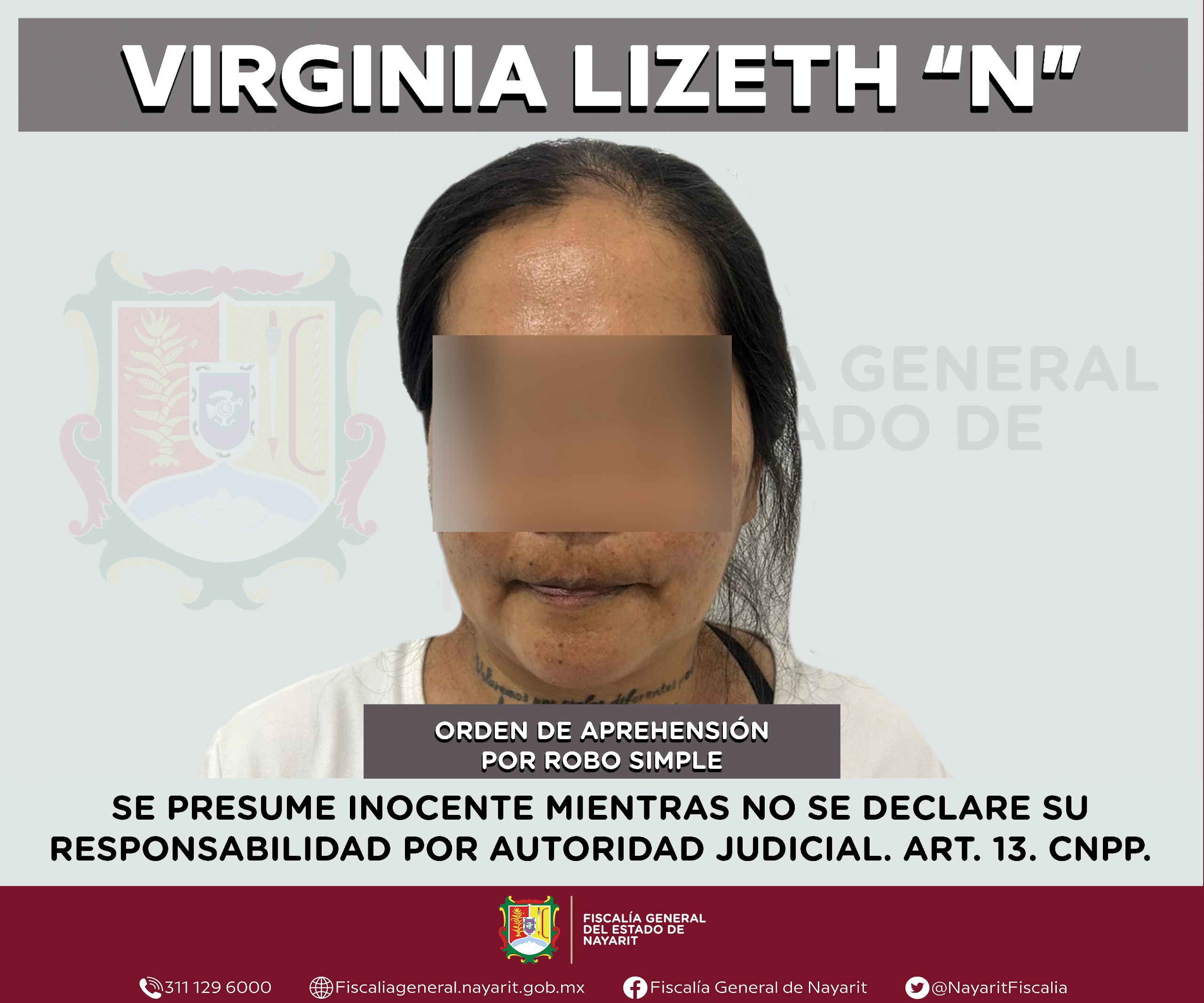 La Fiscalía General de Nayarit informa que a través de la Agencia de Investigación Criminal ejecutó una orden de aprehensión en la ciudad de Tepic contra Virginia Lizeth “N”, por su presunta participación en hechos que la ley tipifica como delito de robo simple, cometido contra Distribuidora Liverpool, S. A. de C. V.
