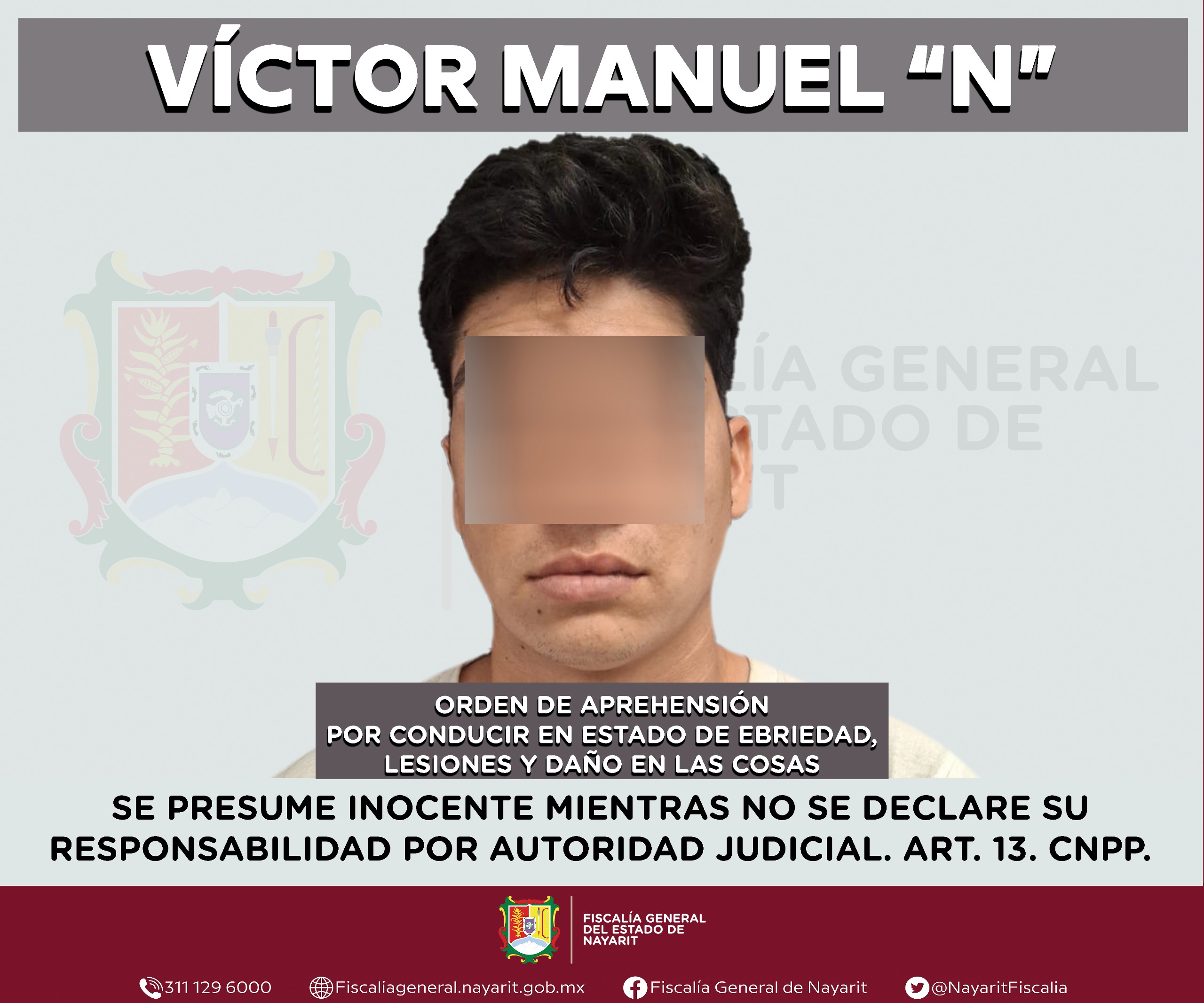 La Fiscalía General de Nayarit informa que a través de la Agencia de Investigación Criminal ejecutó una orden de aprehensión en el municipio de Bahía de Banderas contra Víctor Manuel “N”, por su presunta participación en hechos que la ley tipifica como delitos de lesiones y daño en las cosas y delito de tránsito ejecutado por conductores de vehículos en su modalidad de conducir en estado de ebriedad, cometidos contra una persona de sexo femenino y de la sociedad.