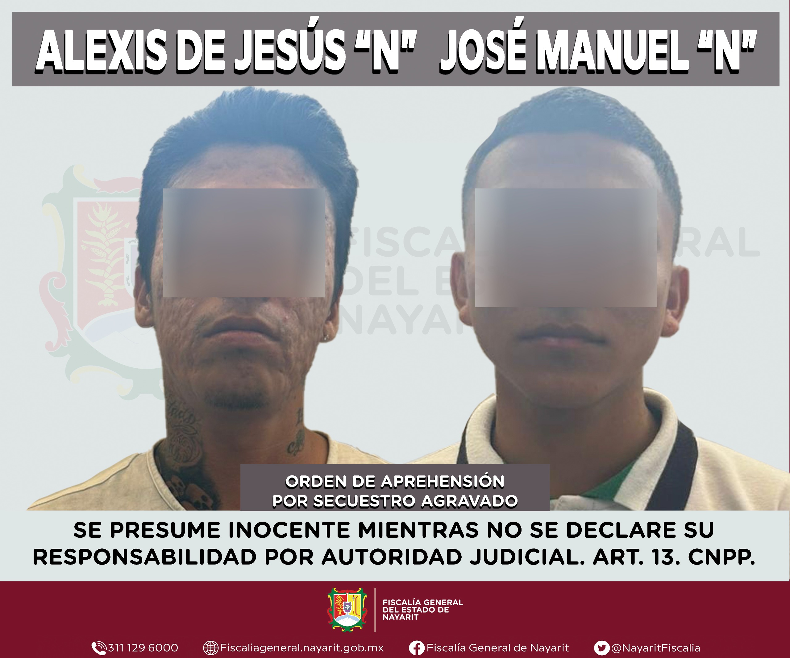 La Fiscalía General de Nayarit informa que a través de la Agencia de Investigación Criminal ejecutó una orden de aprehensión en la capital nayarita contra José Manuel “N” y Alexis de Jesús “N”, por su presunta participación en hechos que la ley tipifica como delito de secuestro agravado, cometido en agravio de una persona de sexo masculino cuya identidad se reserva con la intención de salvaguardar su privacidad e integridad.