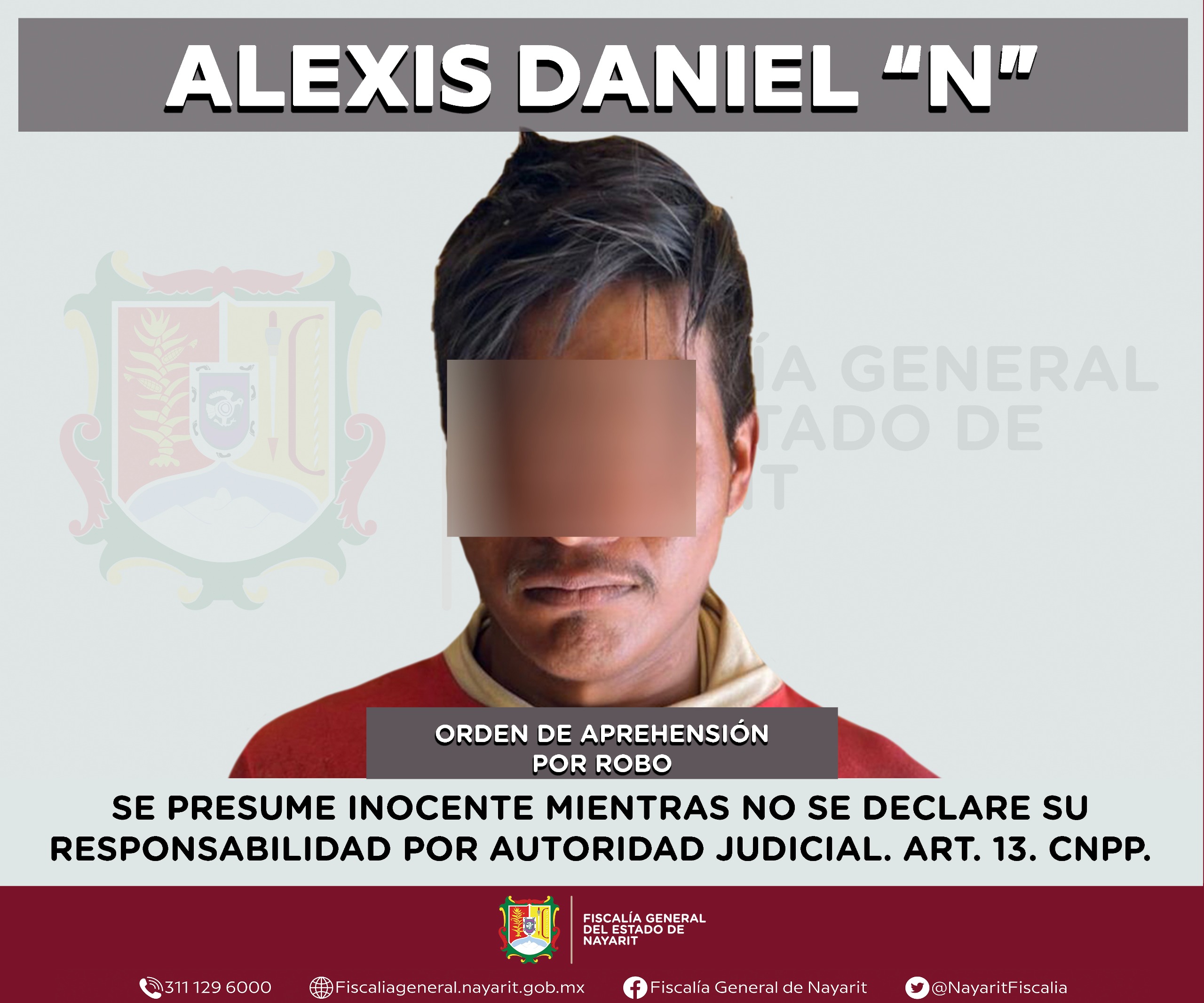 La Fiscalía General de Nayarit informa que a través de la Agencia de Investigación Criminal ejecutó una orden de aprehensión en la ciudad de Tepic contra Alexis Daniel “N”, por su presunta participación en hechos que la ley tipifica como delito de robo, cometido contra una persona de sexo masculino de quien se reserva la identidad para salvaguardar su privacidad e integridad.