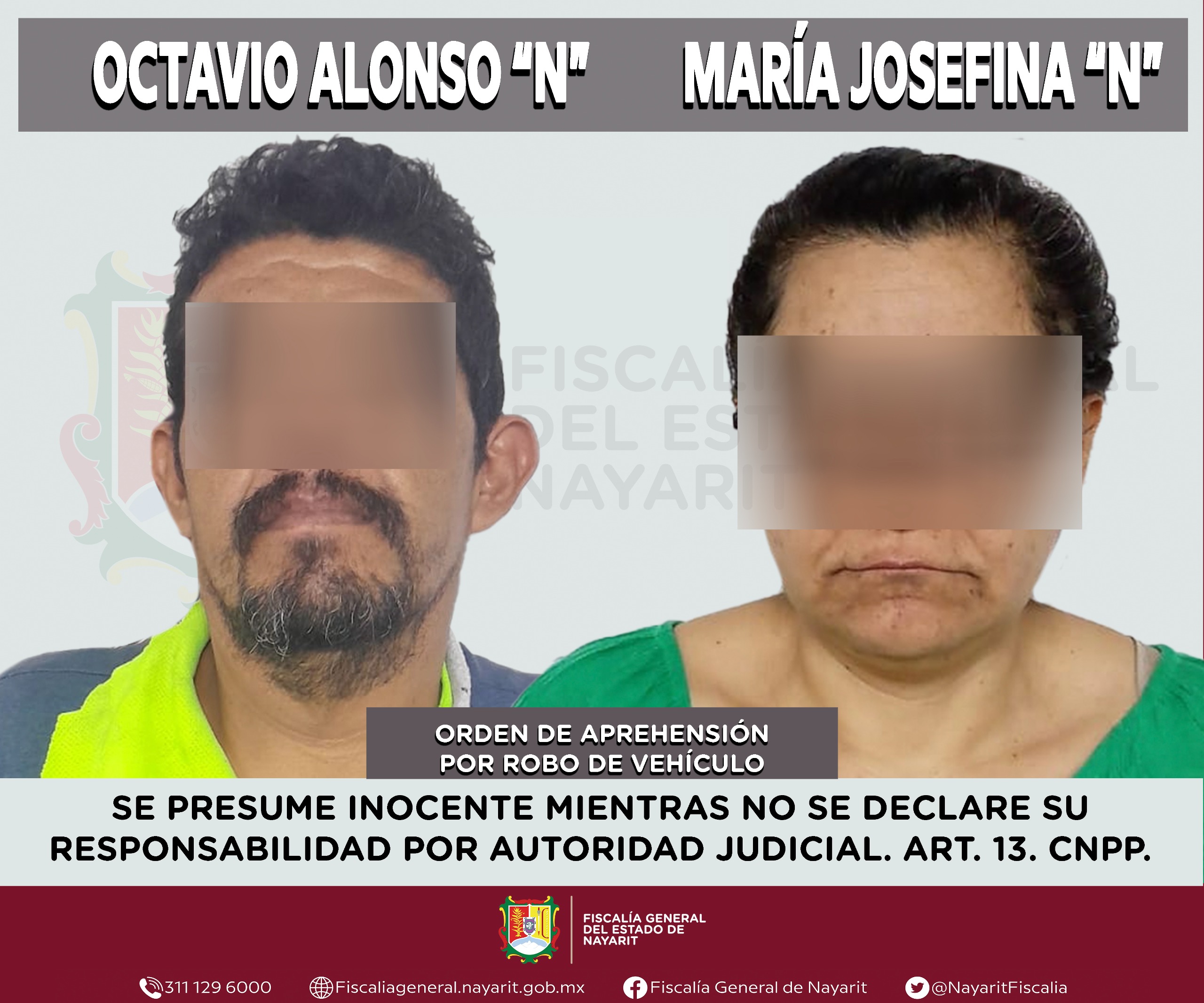 La Fiscalía General de Nayarit informa que a través de la Agencia de Investigación Criminal ejecutó una orden de aprehensión en la capital nayarita contra María Josefina “N” y Octavio Alonso “N”, por su presunta participación en hechos que la ley tipifica como delito de robo calificado -vehículo-, cometido en agravio de una persona de sexo masculino cuya identidad se reserva con la intención de salvaguardar su privacidad e integridad.