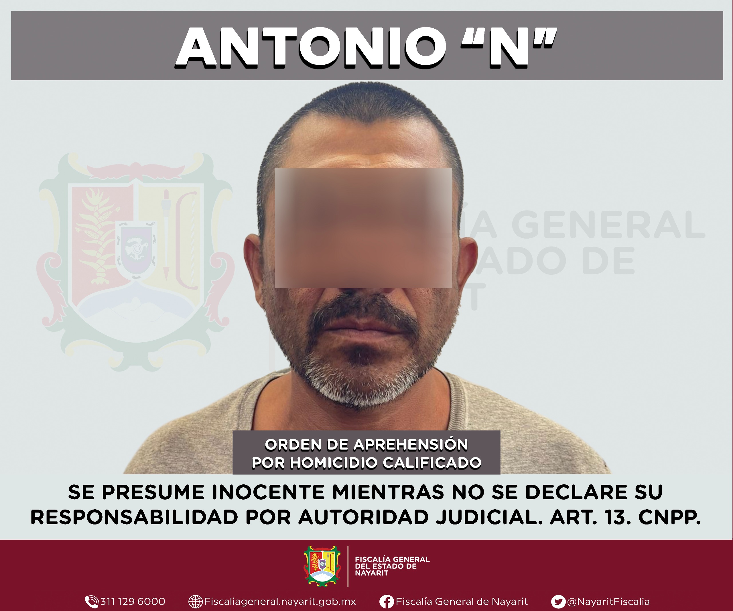 La Fiscalía General de Nayarit informa que a través de la Agencia de Investigación Criminal ejecutó una orden de aprehensión en la capital nayarita contra Antonio “N”, por su presunta participación en hechos que la ley tipifica como delito de homicidio calificado, cometido en agravio de una persona de sexo masculino de quien se reserva la identidad para salvaguardar su privacidad.