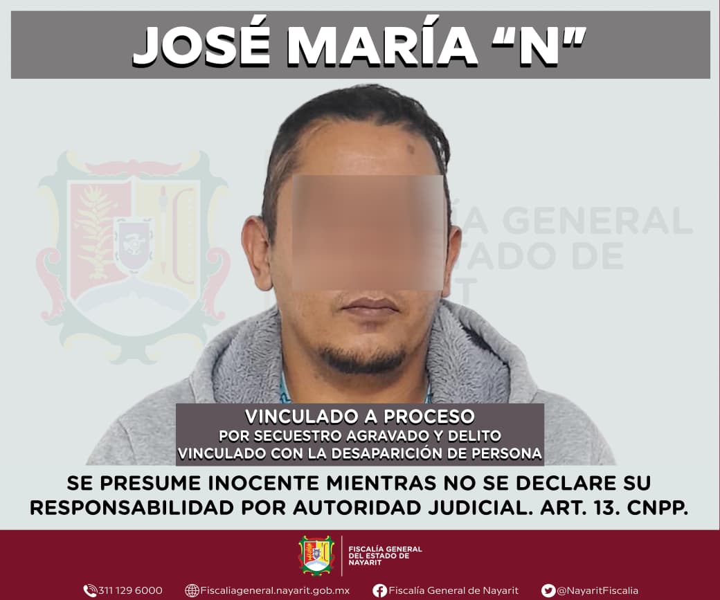 Tepic, Nayarit; 25 de marzo de 2026. – La Fiscalía General del Estado de Nayarit informa que José María “N” fue vinculado a proceso por su probable responsabilidad en los delitos de secuestro agravado y delito vinculado con la desaparición de persona, cometidos en agravio de una persona del sexo masculino.