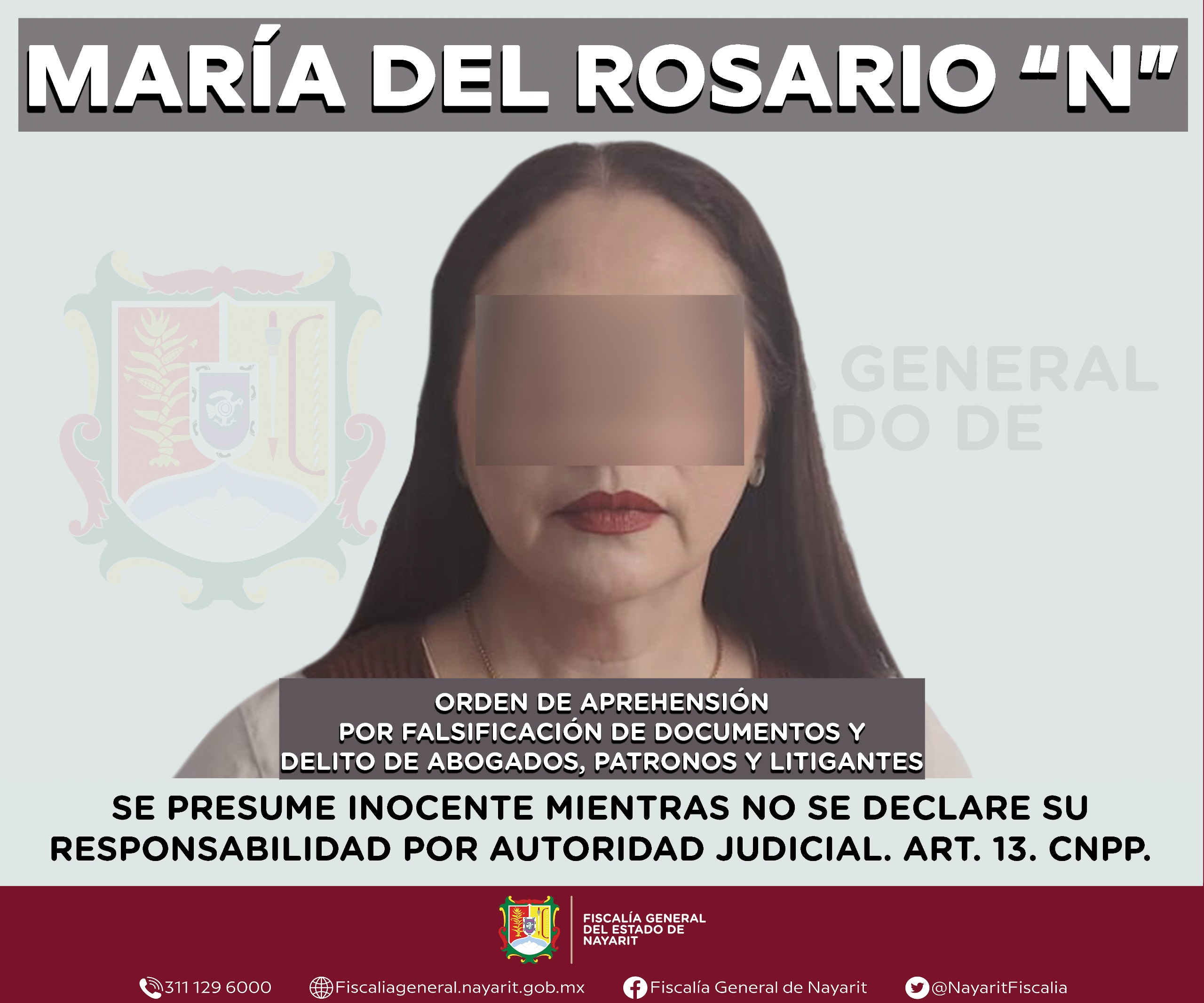 La Fiscalía General del Estado de Nayarit informa que a través de la Agencia de Investigación Criminal de Nayarit ejecutó una orden de aprehensión en la ciudad de Tepic contra María del Rosario “N”, por su presunta participación en hechos que la ley tipifica como delito de falsificación de documentos en su modalidad de uso, así como el delito de abogados, patronos y litigantes, cometidos contra dos personas de sexo femenino de quienes se reservan las identidades para salvaguardar su privacidad e integridad.
