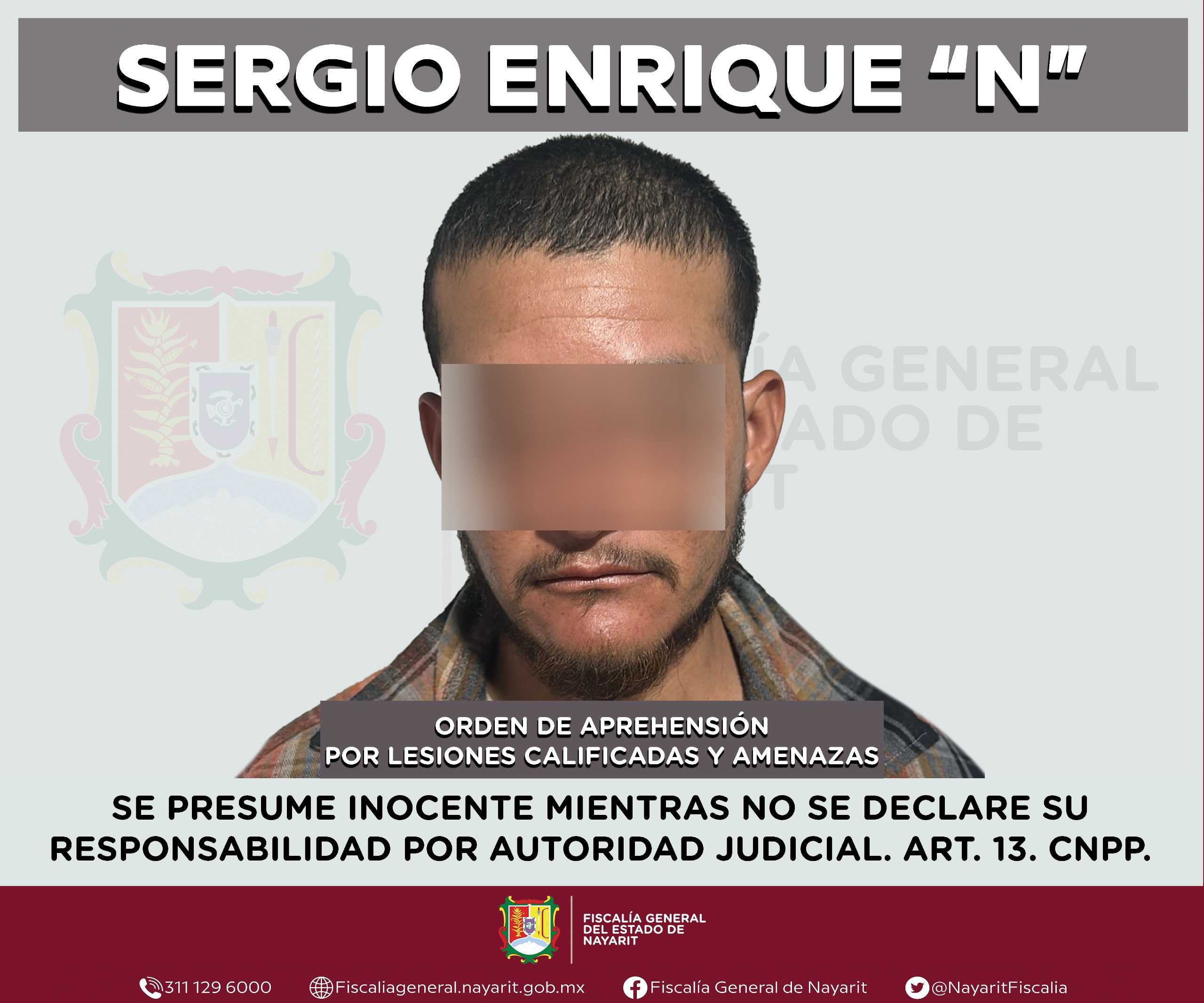 Elementos de la Agencia de Investigación Criminal de Nayarit ejecutaron una orden de aprehensión en la localidad La Presa, municipio de Santiago Ixcuintla contra Sergio Enrique “N”, por su presunta participación en hechos que para la ley configuran los delitos de lesiones calificadas y amenazas, cometidos en agravio de una persona de sexo masculino de quien se reserva la identidad para salvaguardar su privacidad.