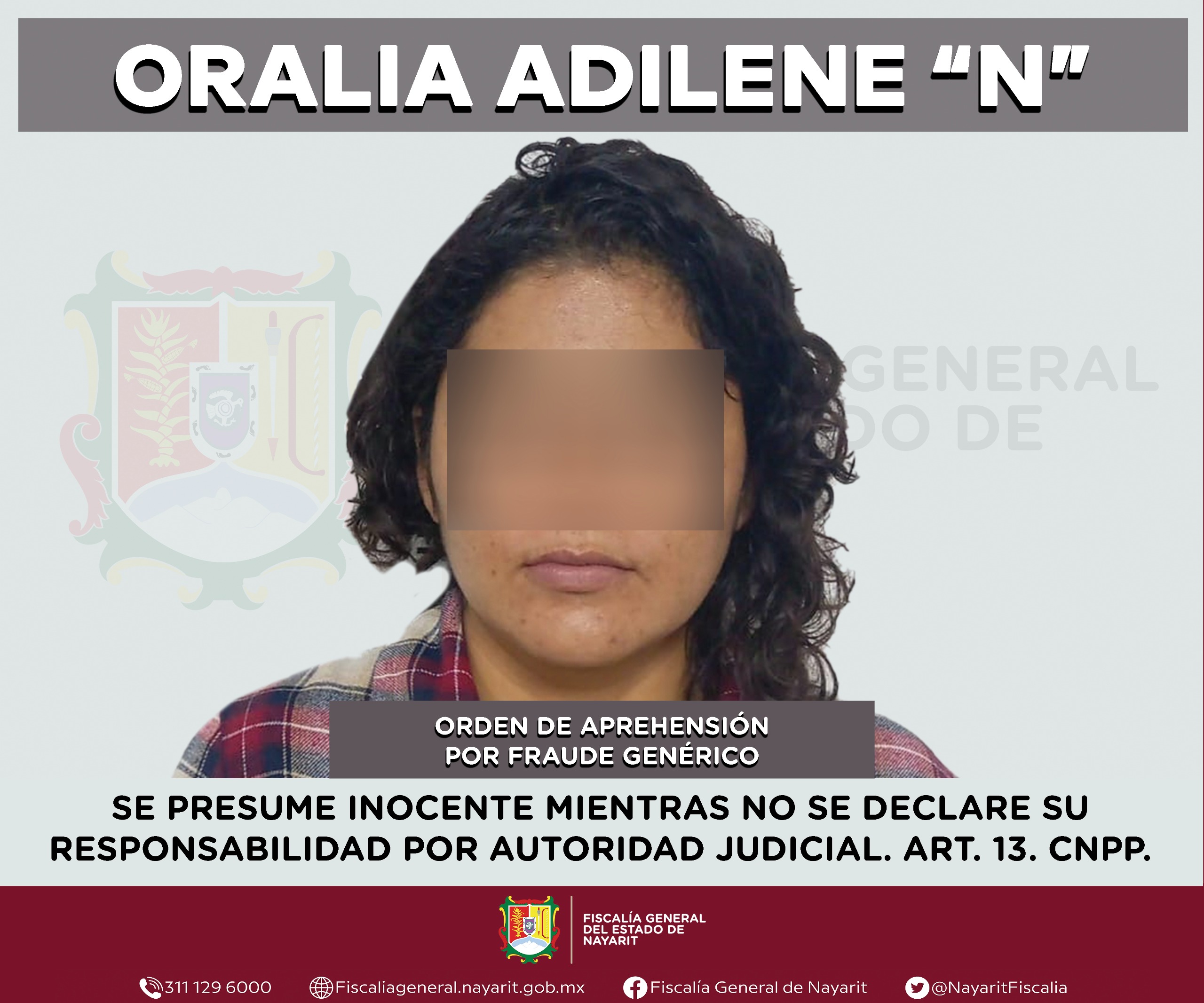 Con la colaboración de la Fiscalía General de Aguascalientes, la Agencia de Investigación Criminal de Nayarit ejecutó una orden de aprehensión en la ciudad de Aguascalientes, Aguascalientes contra Oralia Adilene “N”, por su presunta participación en hechos que la ley tipifica como delito de fraude genérico, cometido en agravio de una persona de sexo masculino de quien se reserva la identidad para salvaguardar su privacidad e integridad.