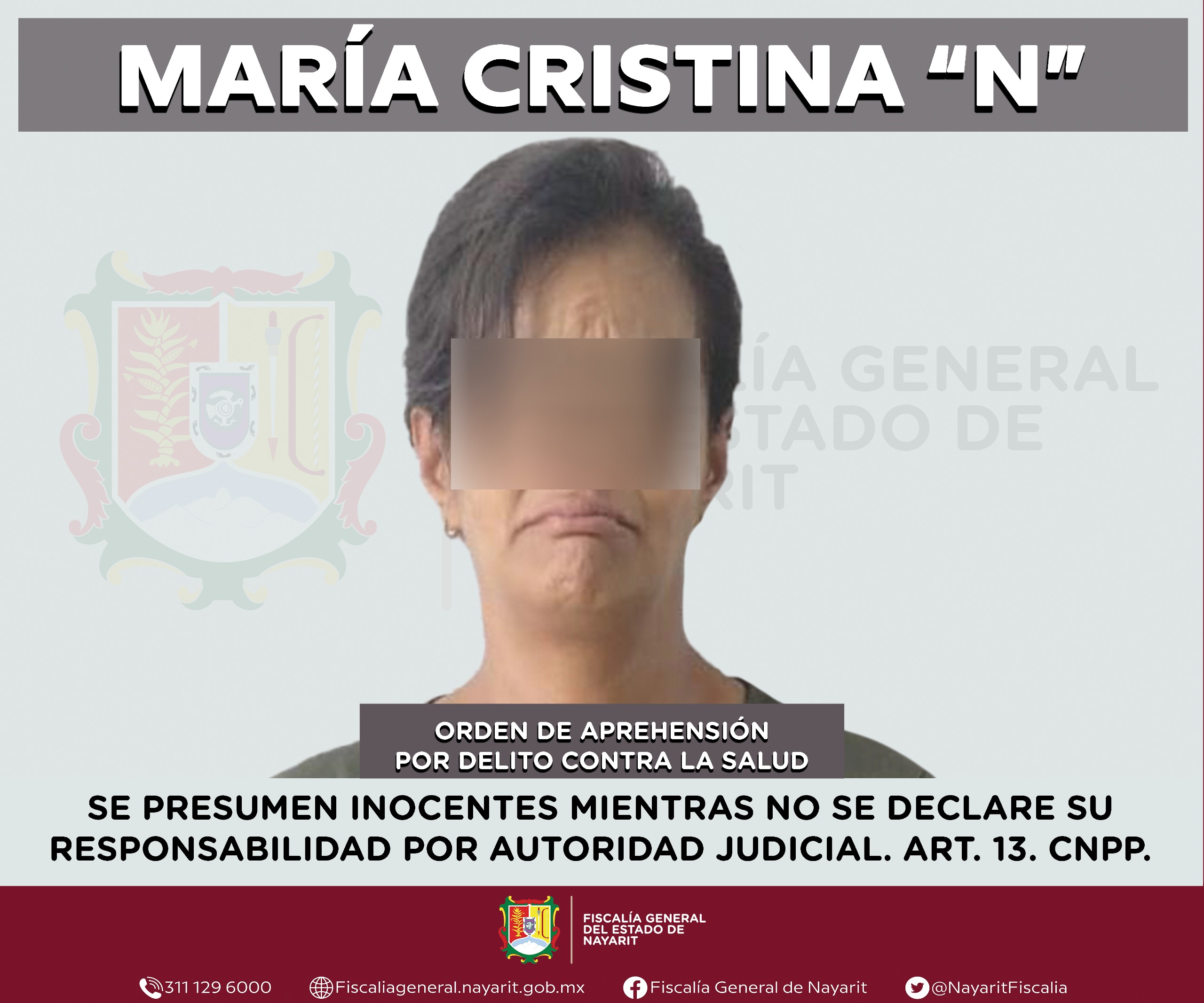 Elementos de la Agencia de Investigación Criminal de Nayarit ejecutaron una orden de aprehensión en la capital nayarita contra María Cristina “N”, por su presunta participación en hechos que la ley tipifica como delito contra la salud en la modalidad de narcomenudeo -en su hipótesis de posesión de psicotrópicos-, cometido contra la sociedad.