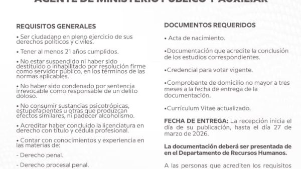 Fiscalía General del Estado de Nayarit convoca a mujeres y hombres egresados de la carrera en Derecho a participar en el proceso de selección...
