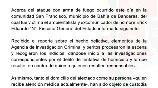 Acerca del ataque con arma de fuego ocurrido este día en la comunidad San Francisco, municipio de Bahía de Banderas, del cual fue víctima...